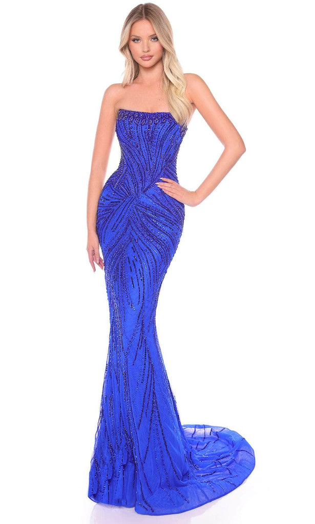 Details: Embellished with Sequins and Hot-Fix Stones, Strapless, Fitted Bodice, Back Zipper Closure, Train
