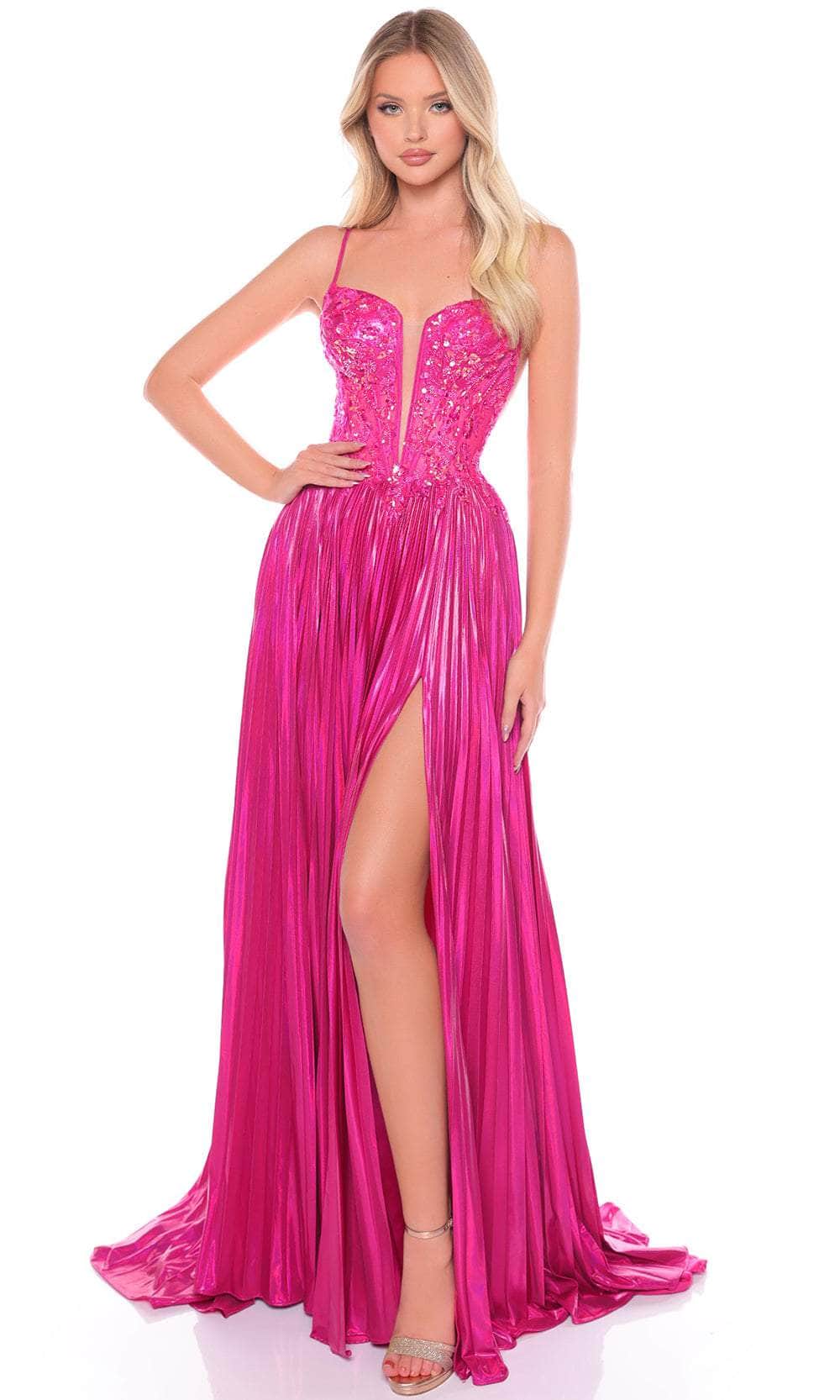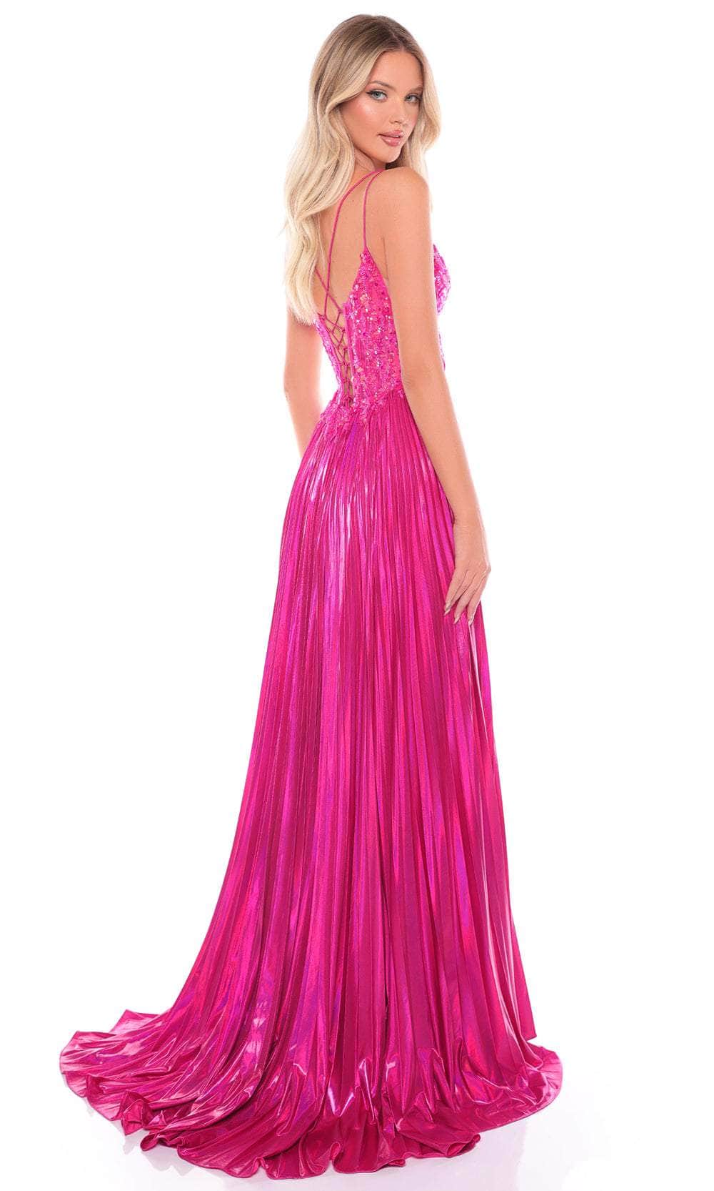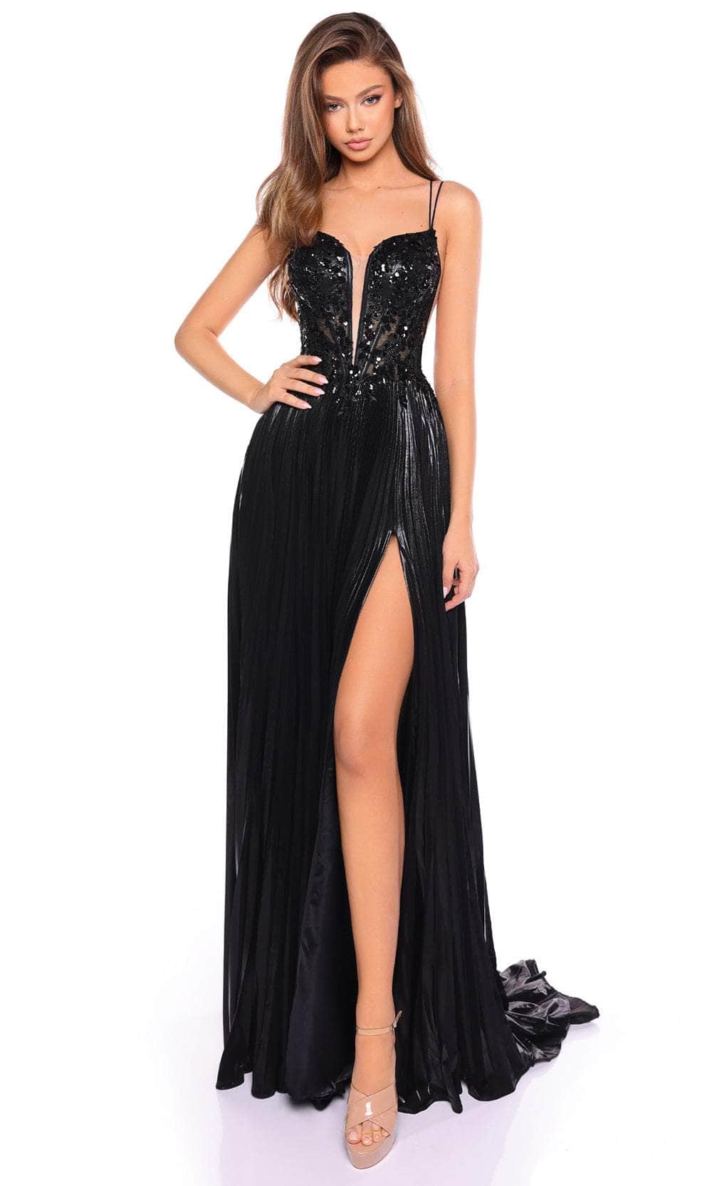 Claim that look of sophistication with this glamorous Amarra 88113, a vision of elegance and allure. Crafted with meticulous finesse, this stunning evening gown boasts a fitted bodice adorned with dazzling embellishments that draw the eye to its plunging neckline. Thin shoulder straps provide graceful support, while a cinched waistline accentuates your silhouette before cascading into a flowing, pleated skirt. A high leg slit adds a touch of drama, highlighting every step with effortless glamour. With its shimmering metallic fabric finish and luxuriously smooth texture, the Amarra 88113 promises to make you the center of attention. Models are wearing Black and Fuchsia colors.
