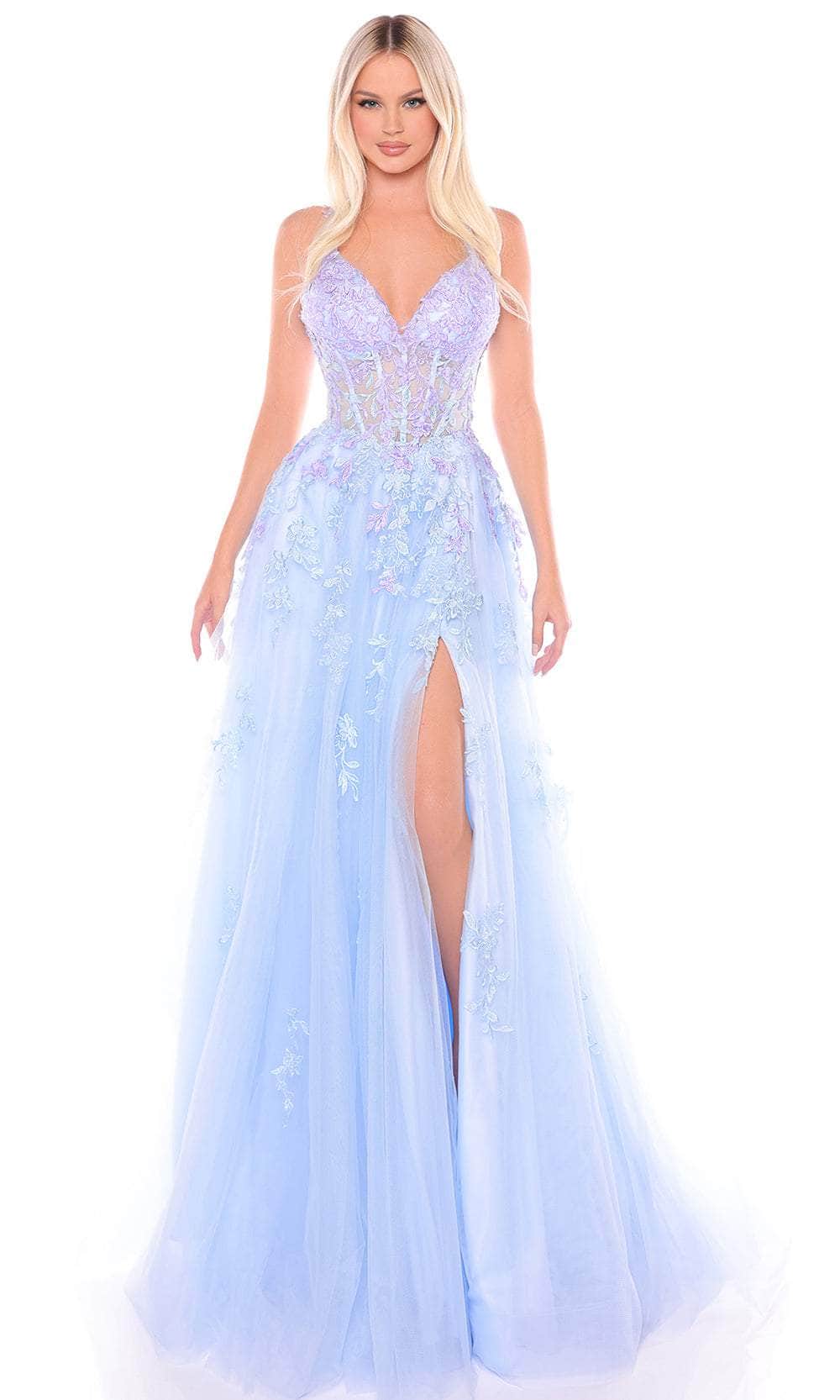 Indulge in timeless elegance with the exquisite Amarra 88115, a gown designed to enchant and captivate. This exquisite piece features a flattering V-neckline and slender straps that gracefully accentuate the shoulders. The form-fitting bodice dazzles with intricate lace detailing, exuding an air of refined elegance. A cinched waistline enhances your silhouette before cascading into a voluminous skirt that elegantly pools at your feet, creating a breathtaking silhouette. Adding a touch of allure, a daring thigh-high slit on the right leg invites a subtle hint of drama to the ensemble. Perfect for those seeking to embody sophistication with a hint of allure, the Amarra 88115 captures the essence of movement and grace, ensuring you make a memorable impression on any special occasion. Model is wearing Light Blue/Lilac color.