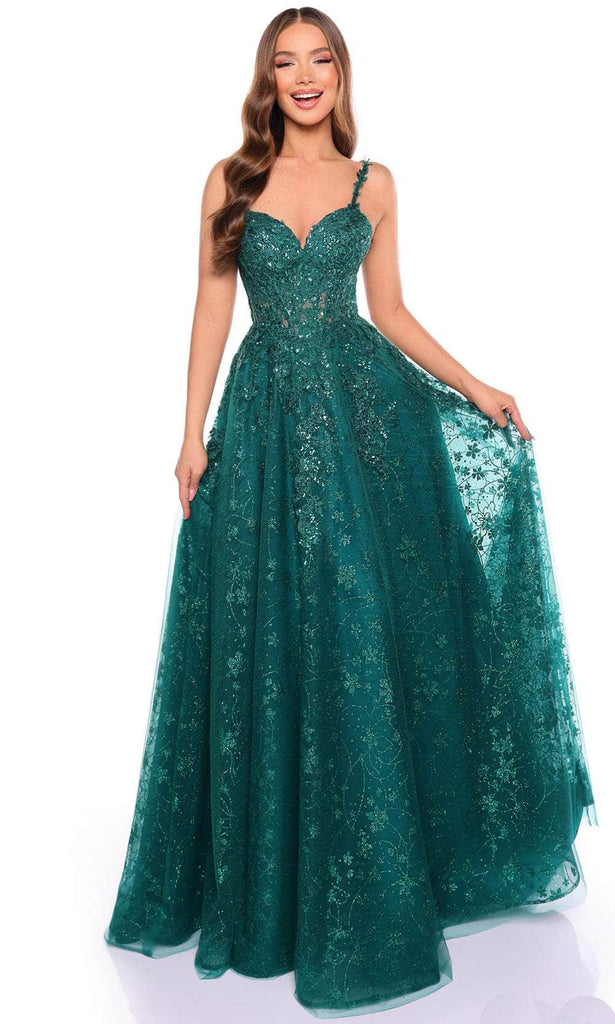 Experience opulence with Amarra 88124, a stunning gown adorned with an intricate pattern of glitter and lace, evoking a sense of timeless elegance. Crafted with meticulous attention to detail, the fitted bodice boasts a sweetheart neckline and delicate shoulder straps, with one seamlessly transitioning into the mesmerizing embellishments that adorn the entirety of the dress. A defined waist gracefully gives way to a voluminous, floor-length skirt, ensuring a regal silhouette that captivates with every step. Flaunt sophistication and allure in this enchanting Amarra 88124, perfect for any special occasion. Models are wearing Slate Blue and Emerald colors.