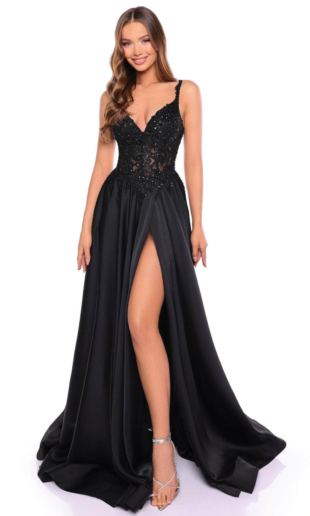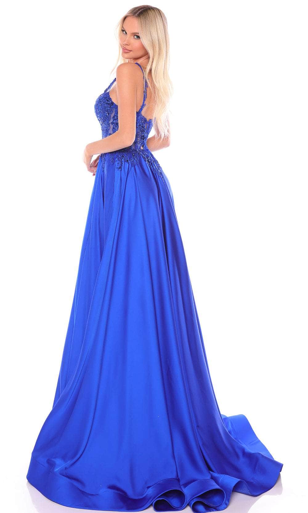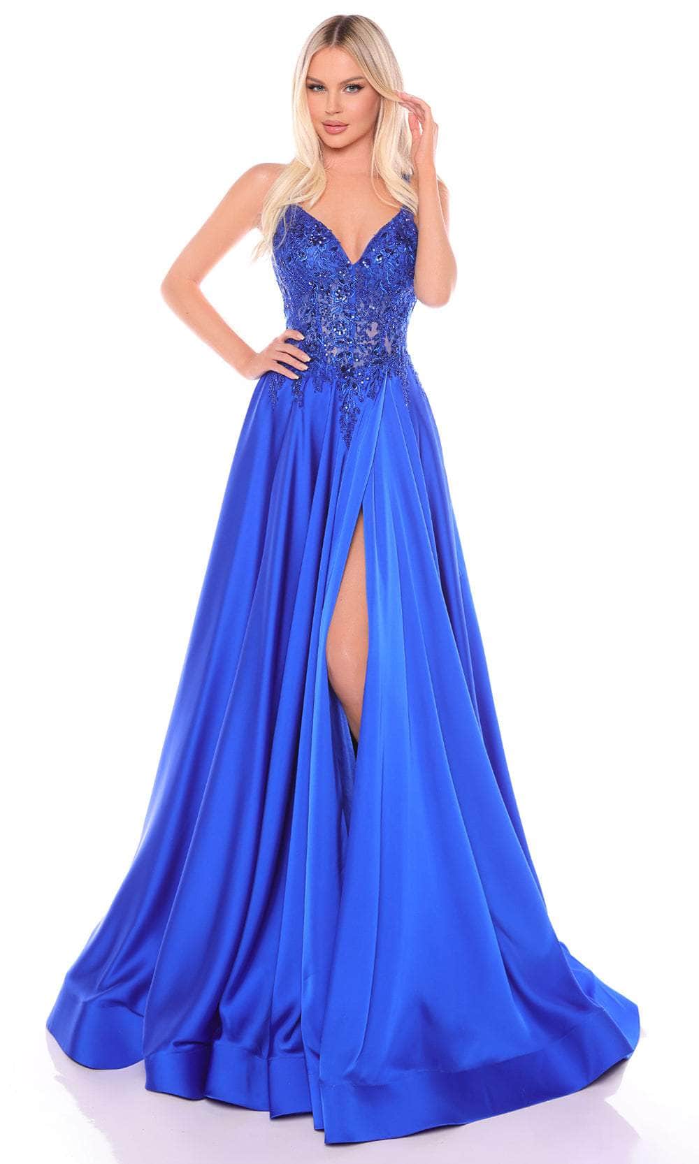 Strike a pose in this magnificent Amarra 88128, a gown that epitomizes sophistication and elegance. Adorned with intricate beadwork and delicate lace cascading from the neckline to the waist, this stunning dress captures opulent beauty. The smooth, silky skirt complements the luxurious top, while the sleeveless design highlights the wearer's shoulders, beautifully accentuated by matching ornate straps. A chic high slit on the left side adds a touch of allure, revealing a hint of leg with each graceful step. Crafted from luxurious, light-reflective fabric, this gown features a floor-kissing hemline that creates a statuesque silhouette. Perfect for grand events, the Amarra 88128 ensures the wearer exudes grace and charm. Models are wearing Royal Blue and Black colors.