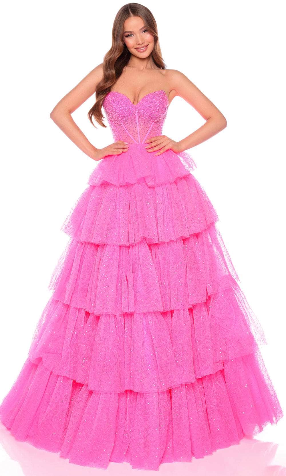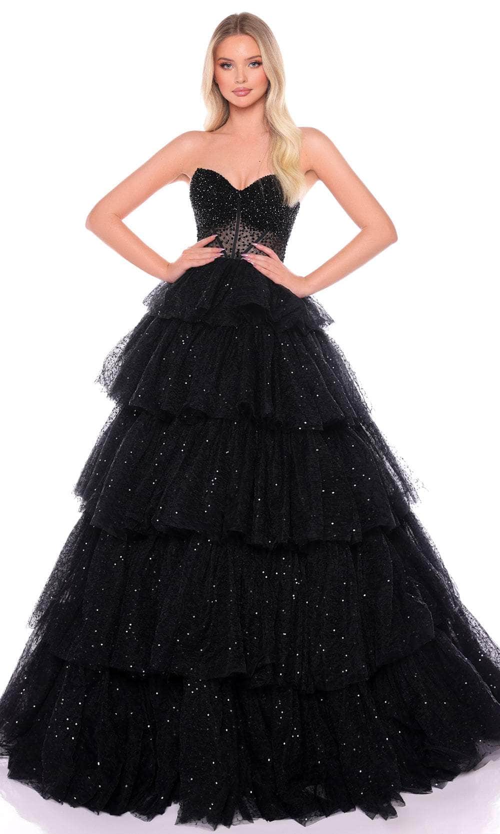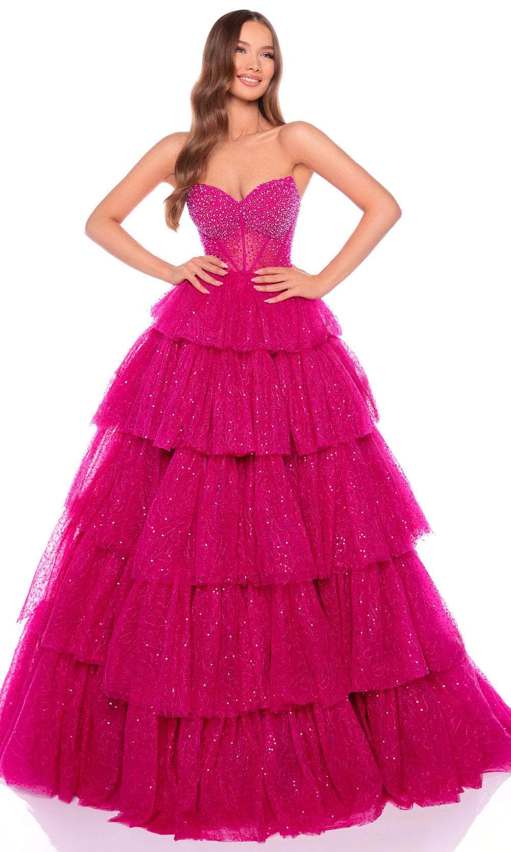 Shine in every way as you mesmerize everyone in this Amarra 88131, an exquisite creation featuring layers of sumptuous ruffled fabric cascading down its length, forming a mesmerizing tiered silhouette that exudes grandeur and opulence. Delicate touches of glitter enhance the gown's allure, imparting a subtle yet dazzling shimmer throughout. The fitted bodice with a charming sweetheart neckline steals the show, bedecked with intricate sparkling embellishments that catch the light with every movement. A sheer bodice adorned with delicate embellishments accentuates its structured elegance and highlights the silhouette. The cinched waist adds definition, effortlessly accentuating the voluminous layers of the skirt, ensuring a breathtaking entrance at any affair. Amarra 88131 guarantees to make an impression. Models are wearing Black, Peacock, Bright Fuchsia, and Hot Pink colors.