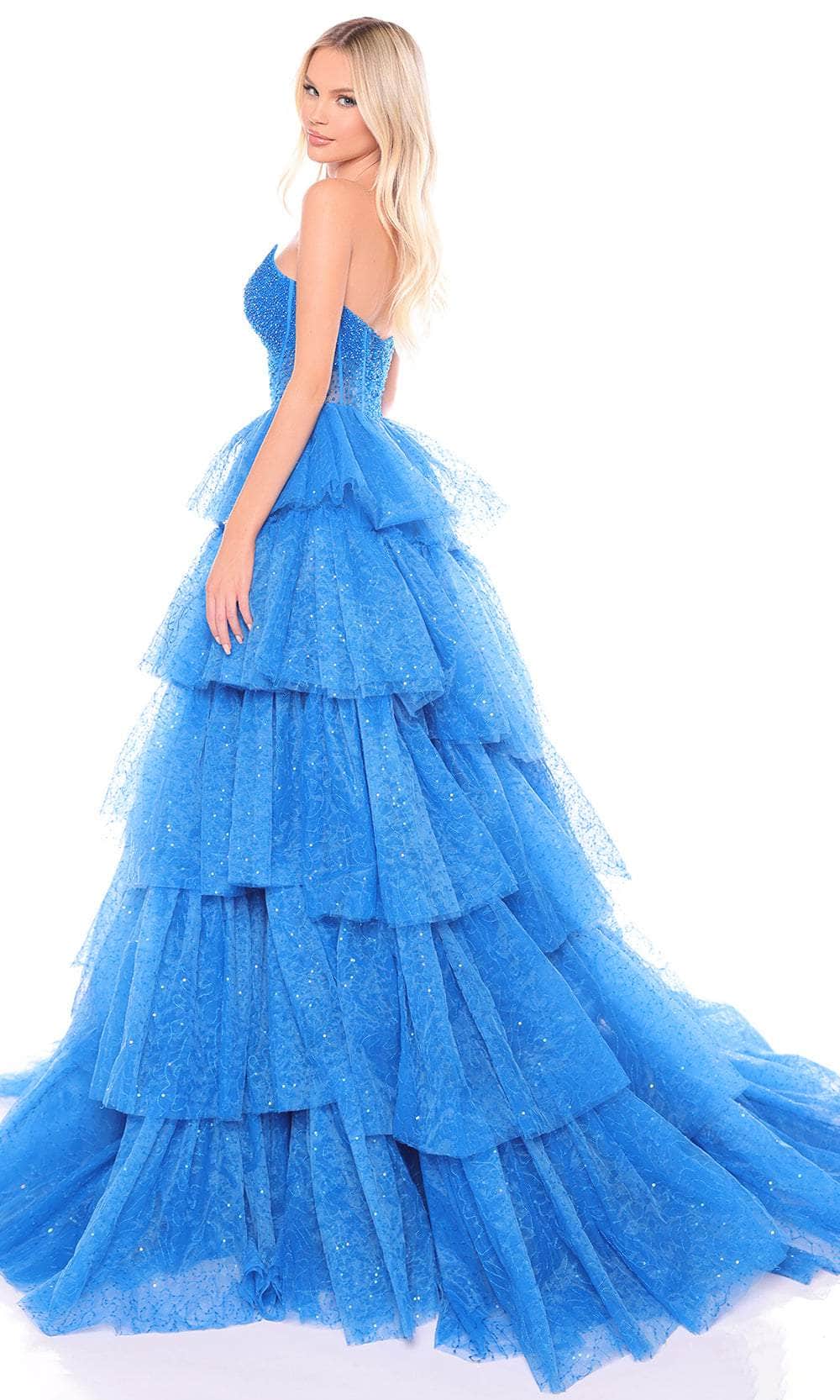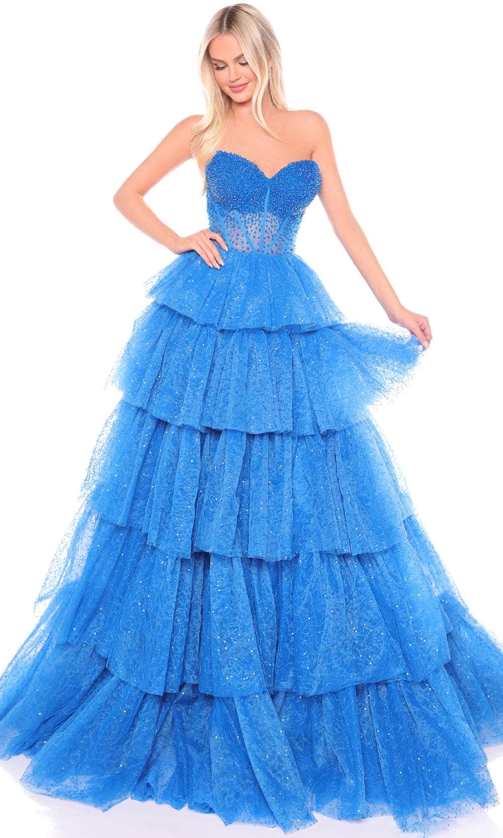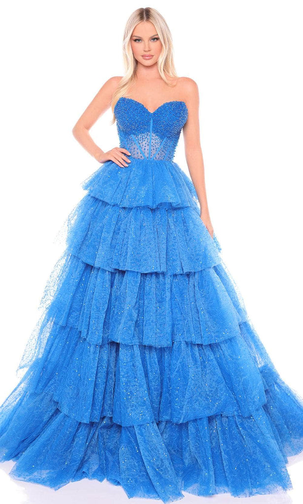 Shine in every way as you mesmerize everyone in this Amarra 88131, an exquisite creation featuring layers of sumptuous ruffled fabric cascading down its length, forming a mesmerizing tiered silhouette that exudes grandeur and opulence. Delicate touches of glitter enhance the gown's allure, imparting a subtle yet dazzling shimmer throughout. The fitted bodice with a charming sweetheart neckline steals the show, bedecked with intricate sparkling embellishments that catch the light with every movement. A sheer bodice adorned with delicate embellishments accentuates its structured elegance and highlights the silhouette. The cinched waist adds definition, effortlessly accentuating the voluminous layers of the skirt, ensuring a breathtaking entrance at any affair. Amarra 88131 guarantees to make an impression. Models are wearing Black, Peacock, Bright Fuchsia, and Hot Pink colors.