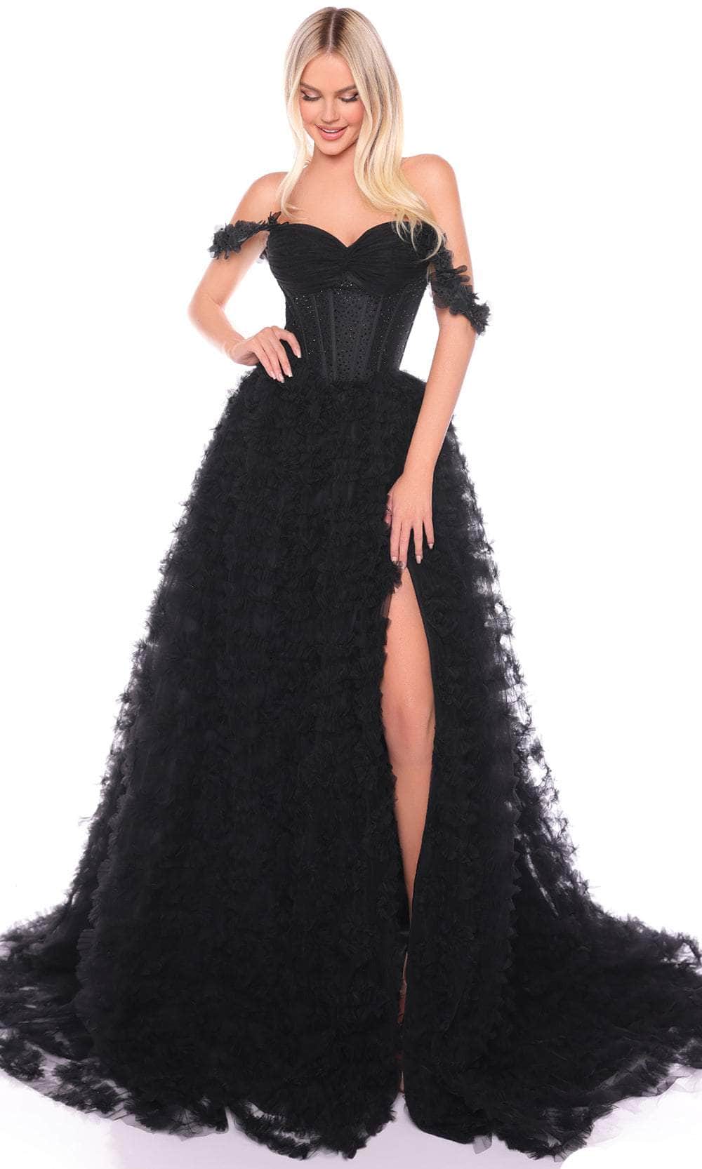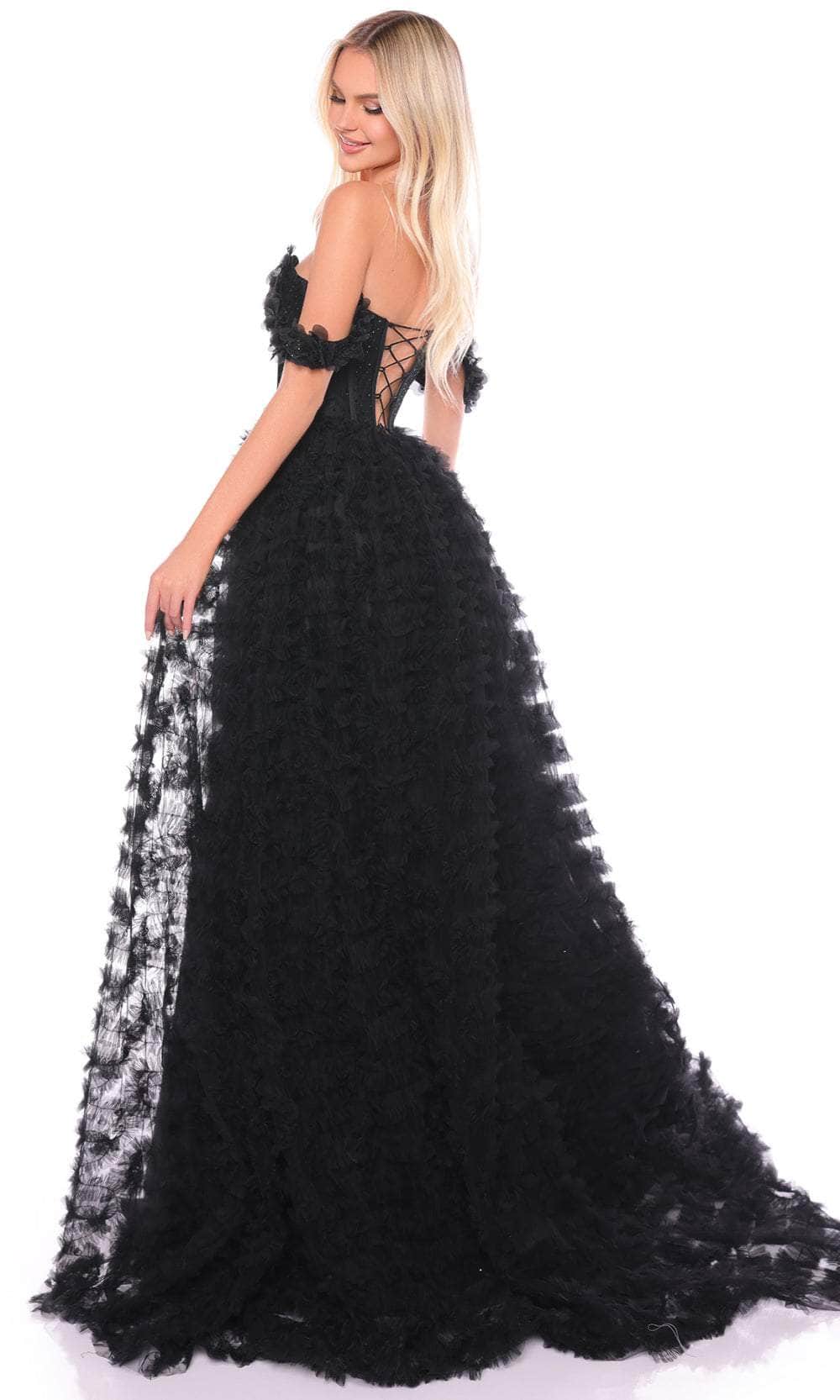 Fascinate the crowd with this Amarra 88152, a black evening gown that exudes romance and drama. The corset-style bodice is adorned with hot stones and features off-the-shoulder straps that beautifully highlight the collarbone. The sweetheart neckline adds a classic, feminine touch, enhancing the gown's romantic aesthetic. A voluminous skirt, crafted from cascading layers of black tulle, adds grandeur, while a daring thigh-high side slit introduces boldness. The back showcases a crisscross lace-up corset design, accentuating your curves perfectly. Ideal for formal events and red-carpet appearances, this Amarra 88152 ensures a memorable fashion statement. Model is wearing Black color.
