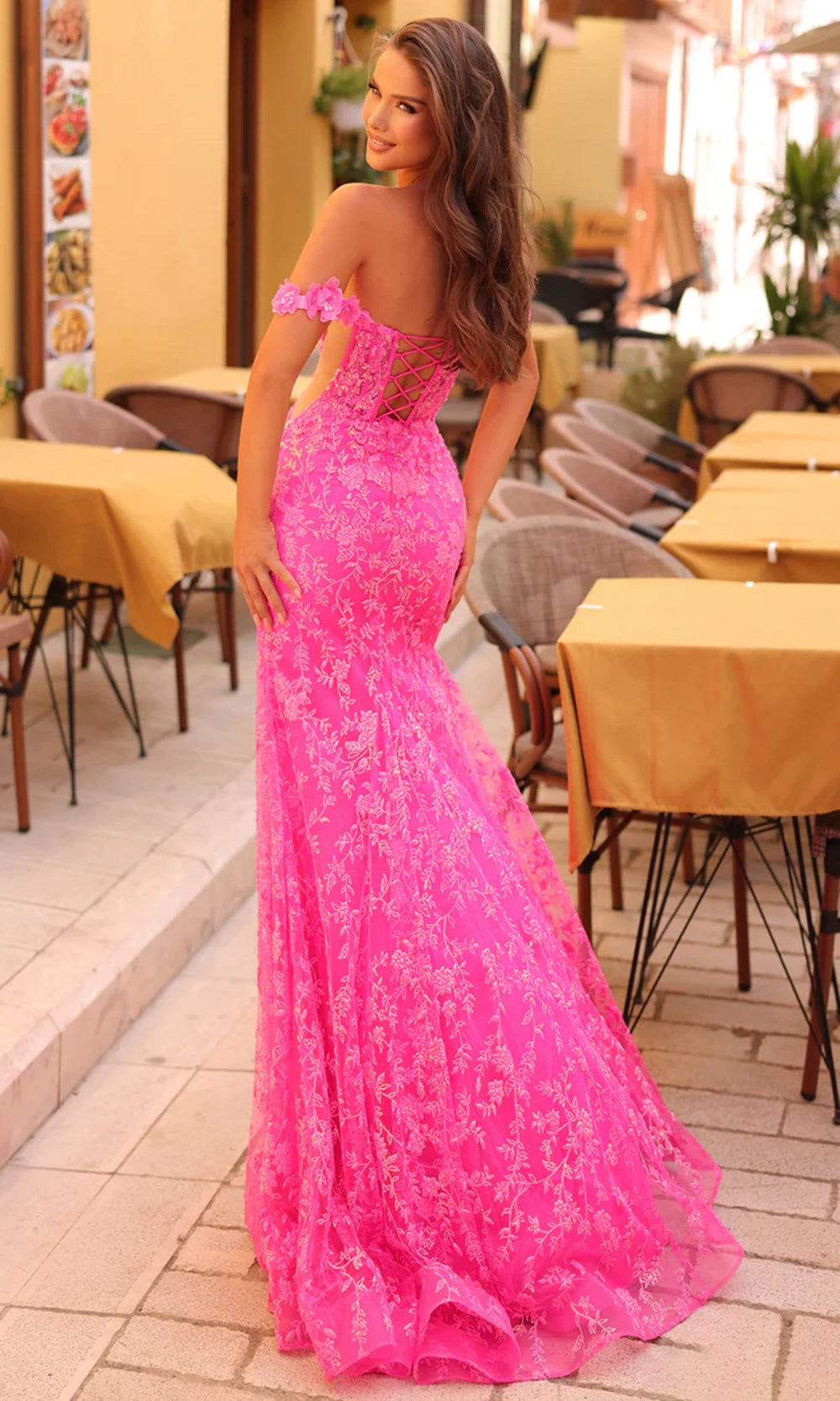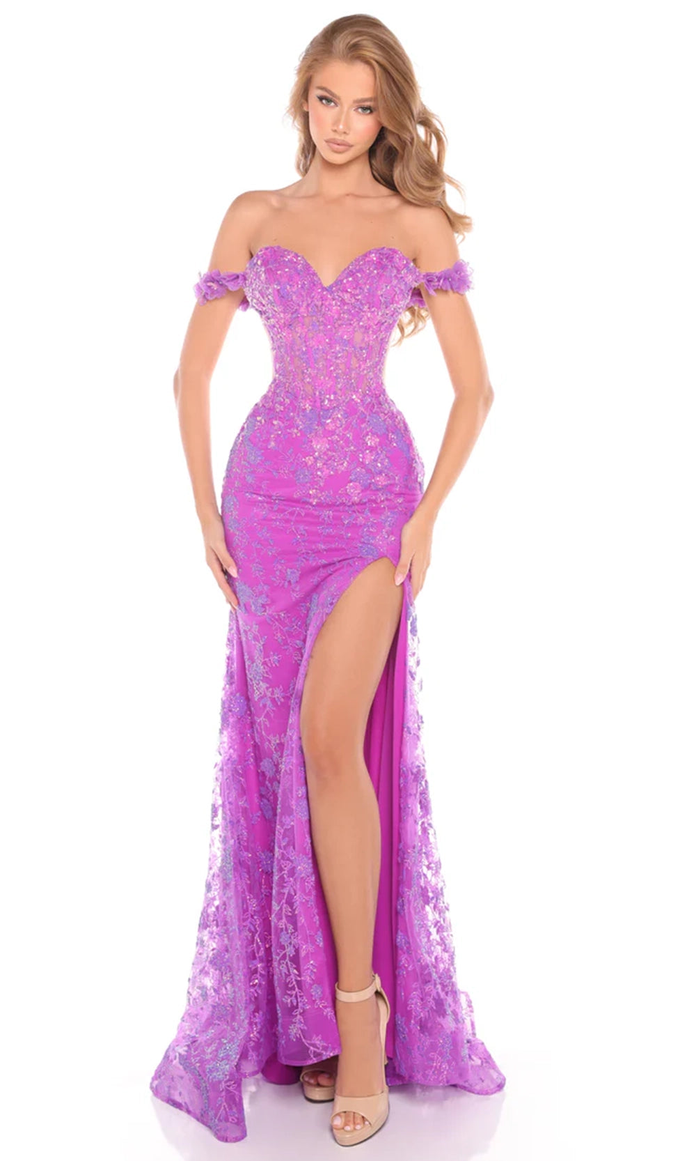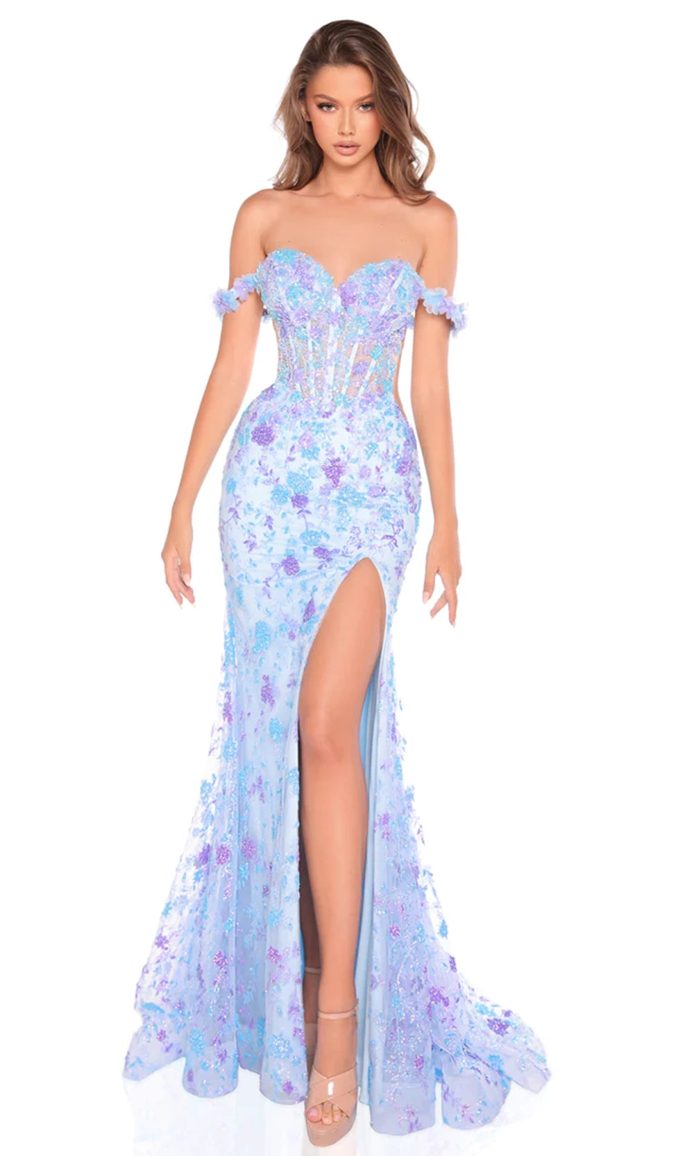 | Details: | Off-Shoulder 3D Floral Sleeves, Thigh-High Slit, Corset Boning Bodice, Lace-Up Back, Floral Glitter Embroidery |