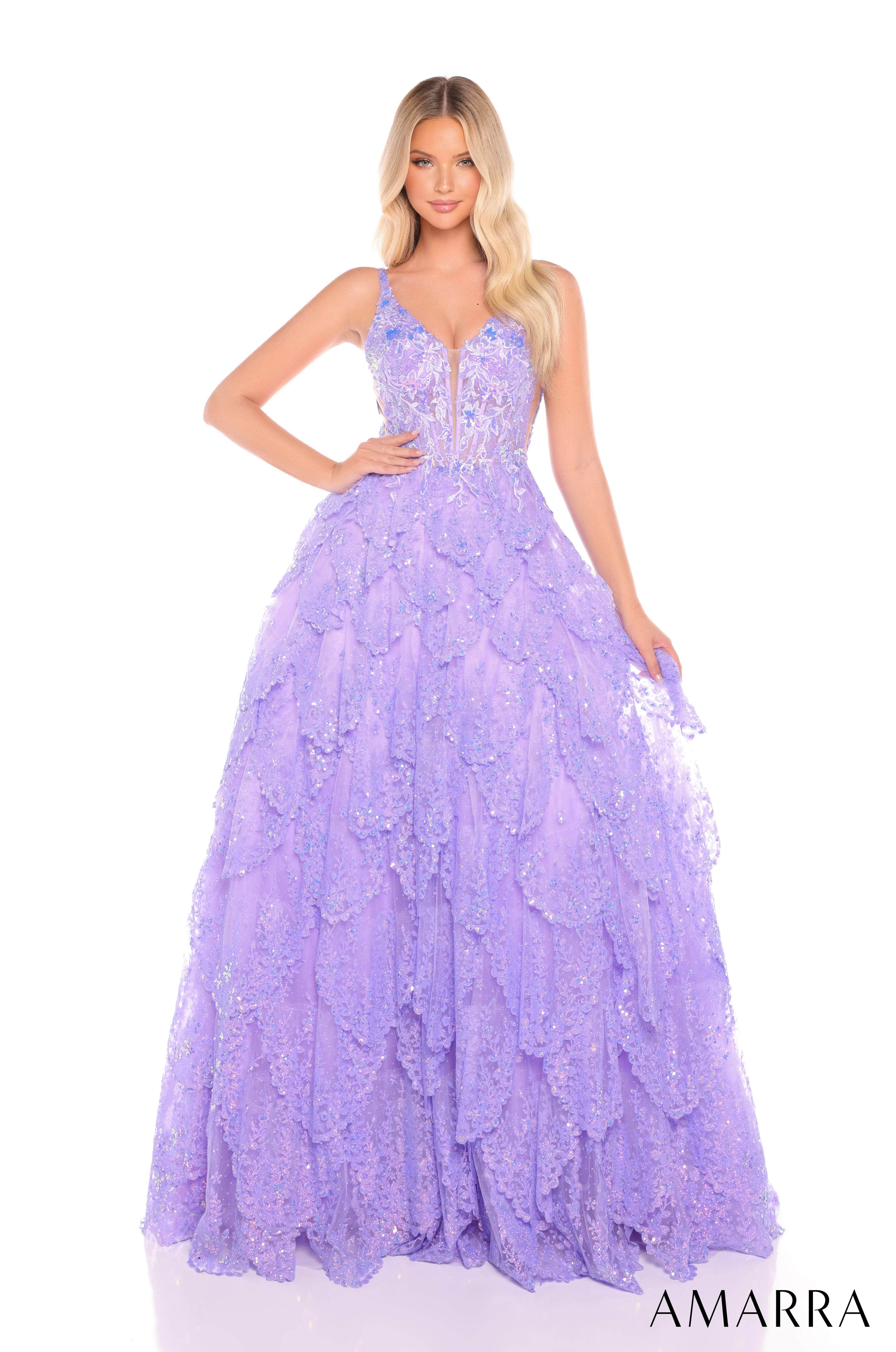 Step into a world of elegance with the Amarra 88265 masterpiece. This stunning A-line features floral lace embroidery and sequins that create a breathtaking texture, adding depth and luxury to the design. A plunging V-neckline accentuates the decolletage, which beautifully supported by spaghetti straps. Delicate tiered lace layers adorn the skirt, creating a captivating and voluminous effect. The attention to detail in this gown makes it an exquisite choice for grand celebrations and formal evenings. Elevate your wardrobe with the Amarra 88265, perfect for making a lasting impression. Models are wearing Barbie Pink, Lilac, Orange, and Wine colors.