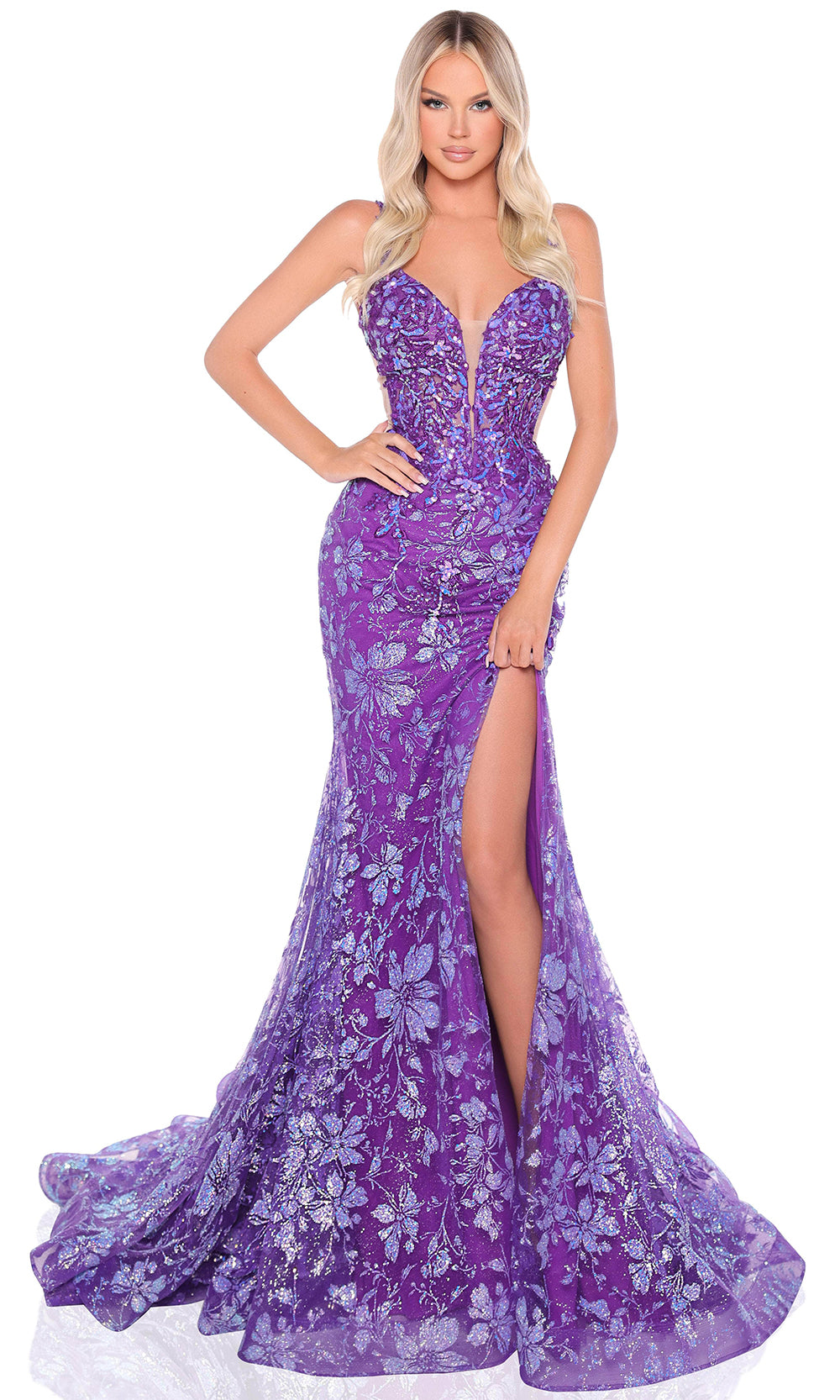 | Details: | Floral Sequins, Structured Bodice, Sheer Side Panels, High Slit, V-Back |