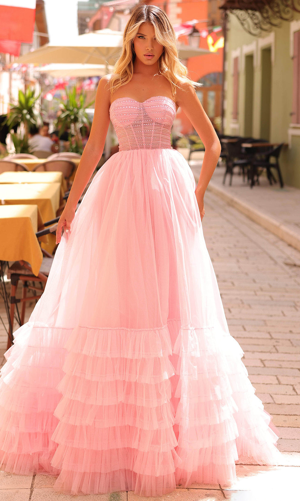 Make a statement in the breathtaking Amarra 88277. The strapless gown features a sweetheart neckline, while its sheer corset bodice is designed for a perfectly sculpted fit. The voluminous layered tulle skirt creates a dreamy effect. Sparkling embellishments on the bodice add a touch of glamour, making this gown a dazzling choice. This Amarra 88277 is an enchanting ballgown made for a fairy-tale moment. Models are wearing Hot Pink, Light Blue, Light Pink, Lilac, and Red colors.
