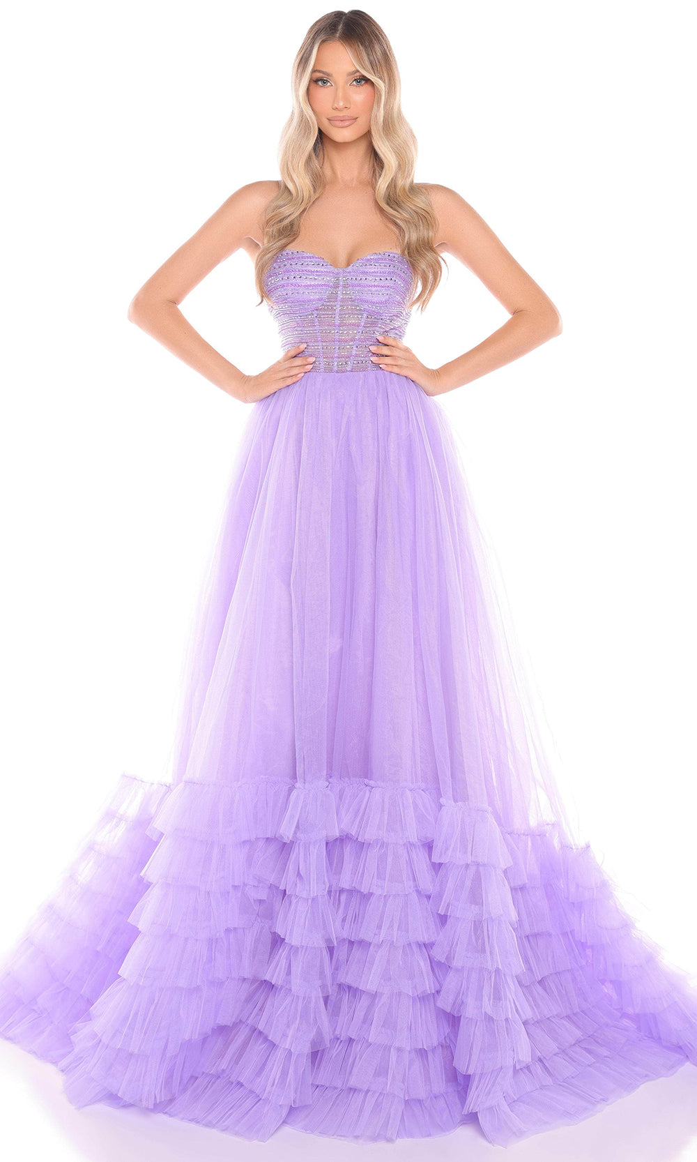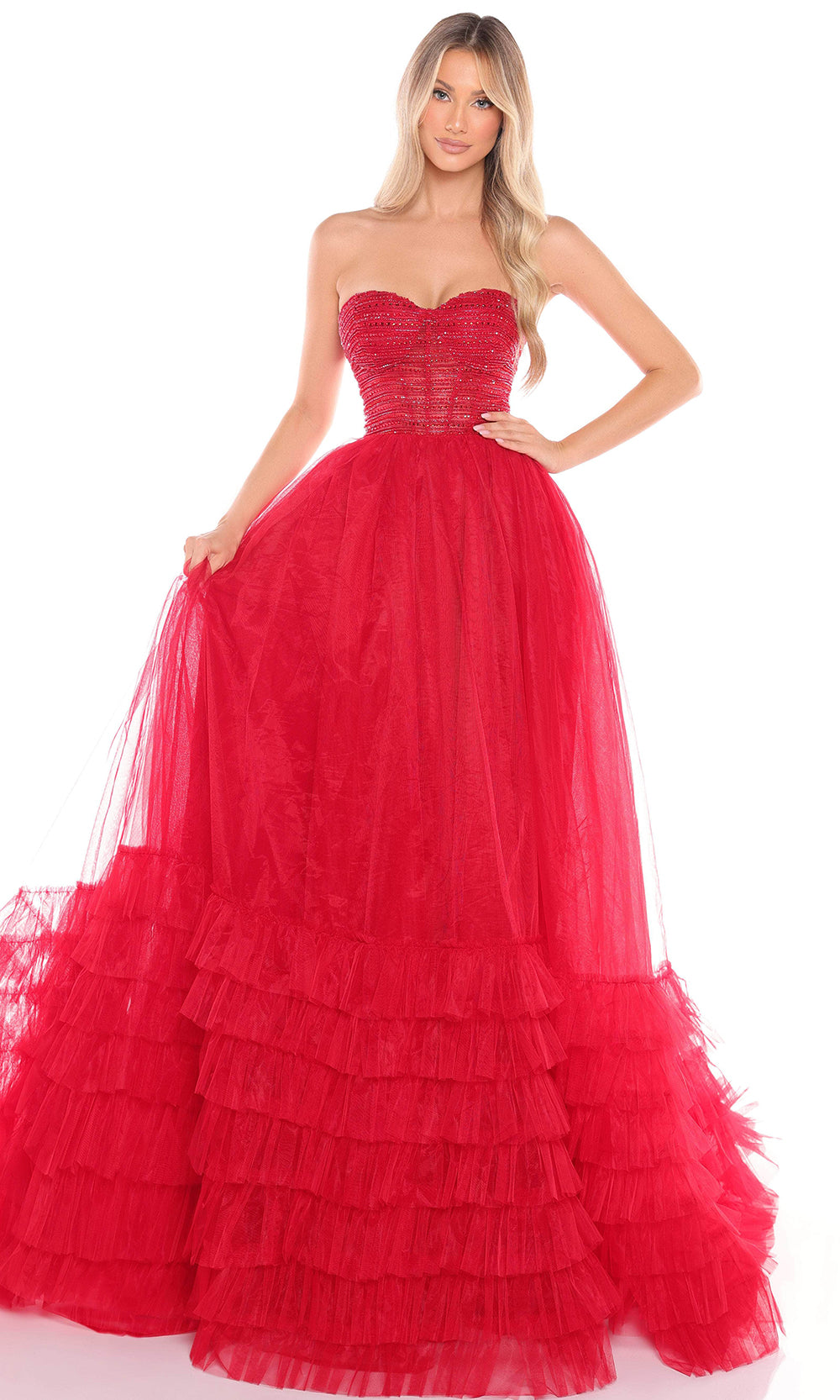 | Details: | Strapless, Sheer Structured Bodice, Beaded Layered Ruffle Skirt |