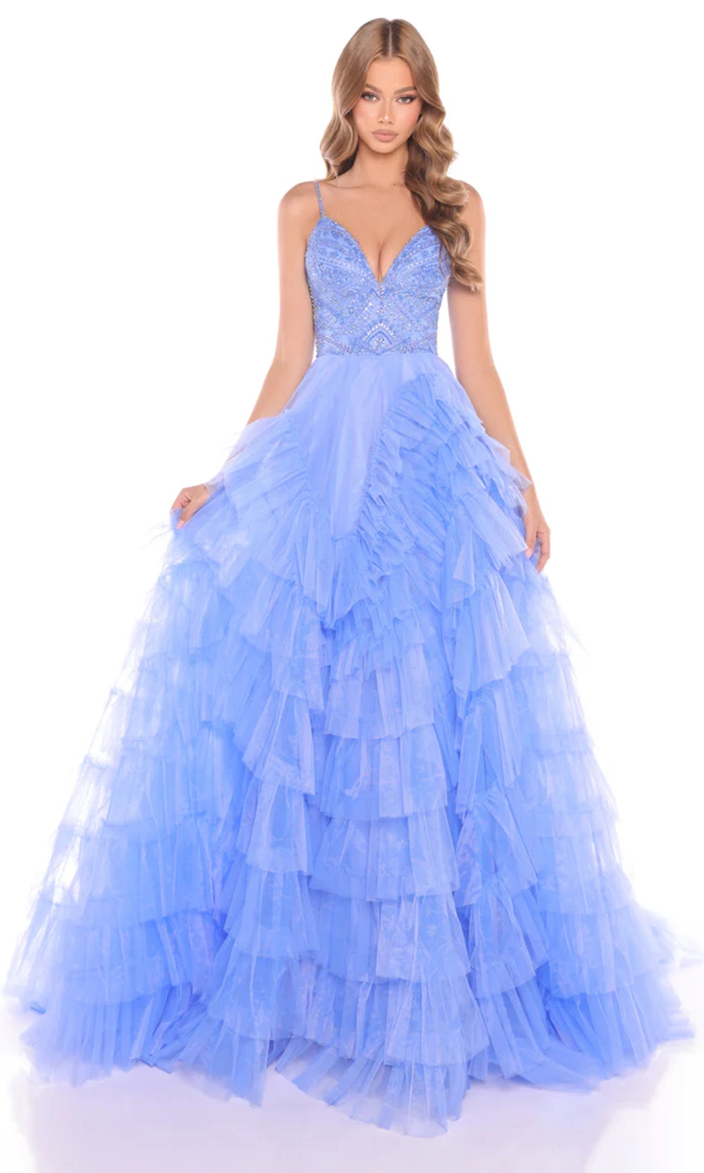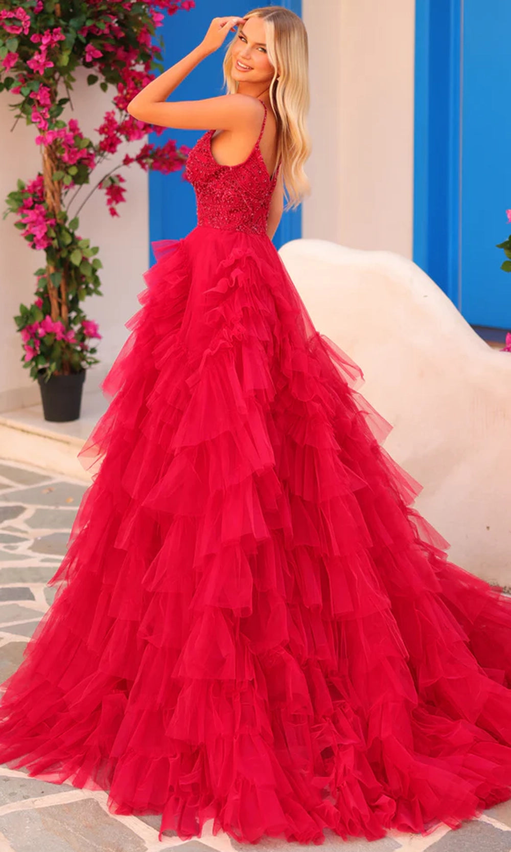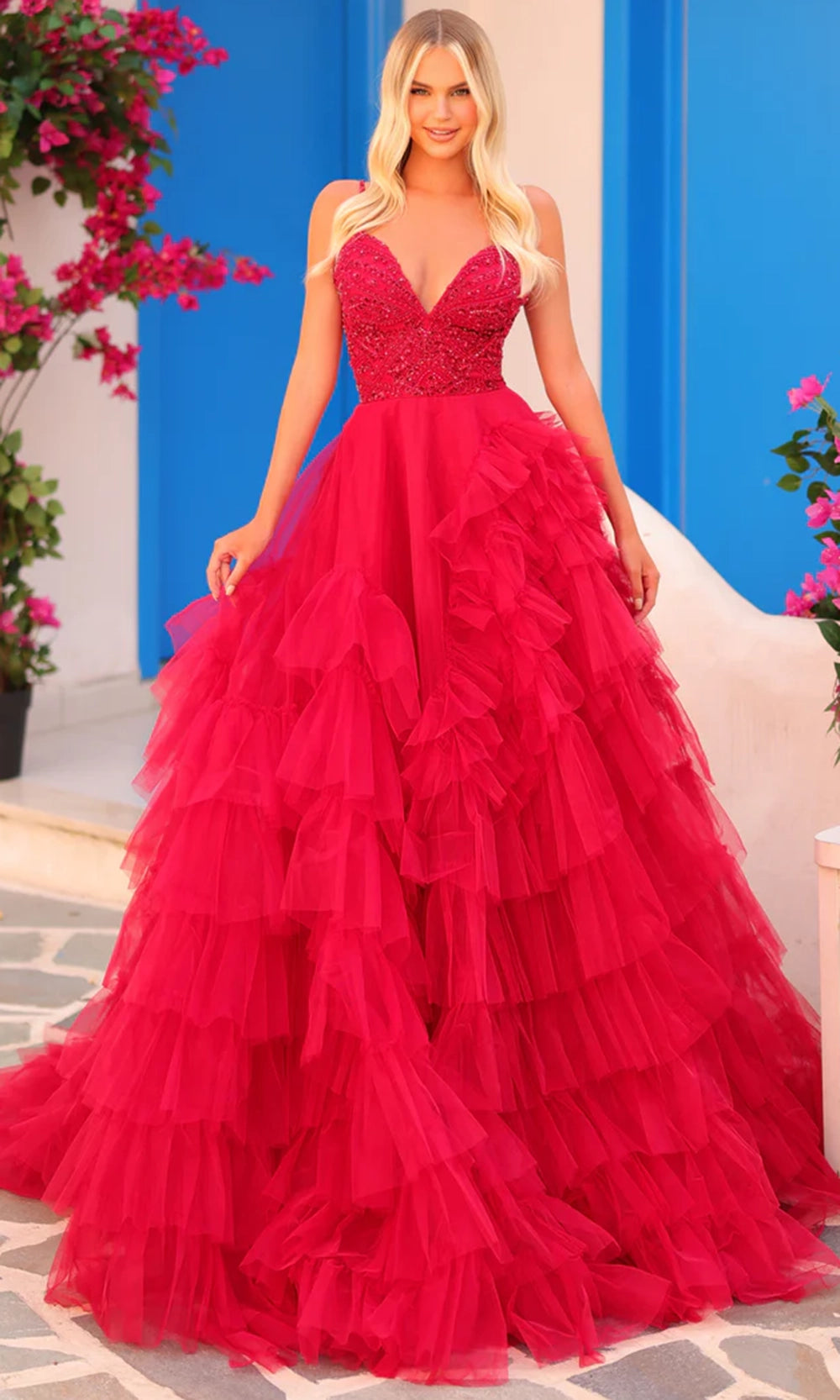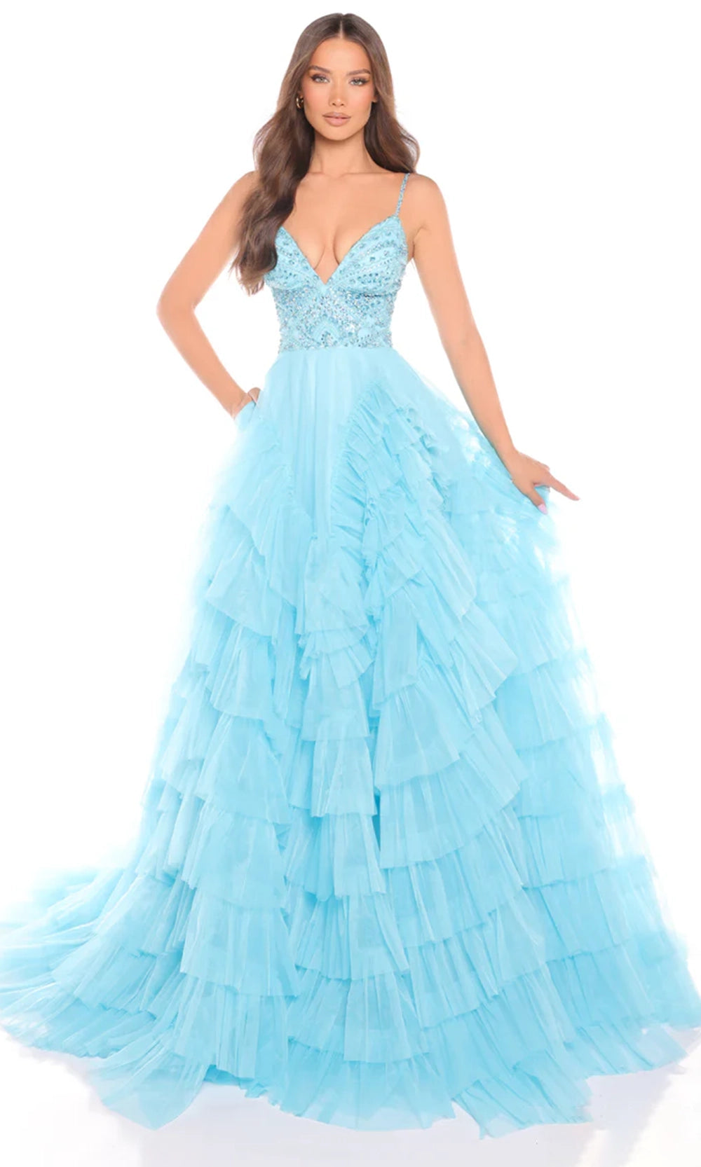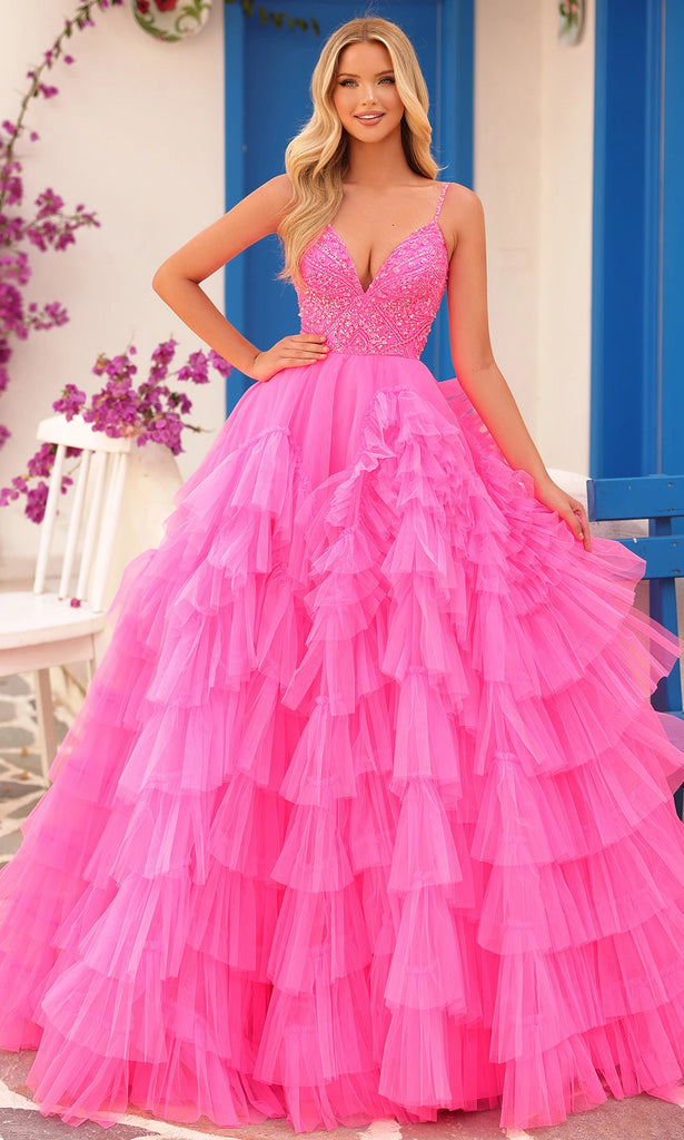 When you wear the Amarra 88296 you enter with a vision of refined drama and timeless elegance. The plunging V-neckline and slender spaghetti straps set the tone of modern sophistication, while the intricately beaded bodice captures light and attention with every movement. The true highlight unfolds below with the tiered ruffle tulle skirt that cascades gracefully to the floor, creating volume, dimension and statement presence. Practical side pockets add a thoughtful, stylish touch to this glamorous design. Make your event momentum unforgettable by choosing the Amarra 88296 for your next special occasion. Models are wearing Hot Pink/Electric Pink, Light Blue, Lilac, Periwinkle, and Red colors.