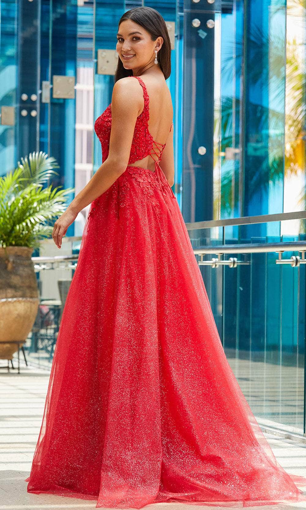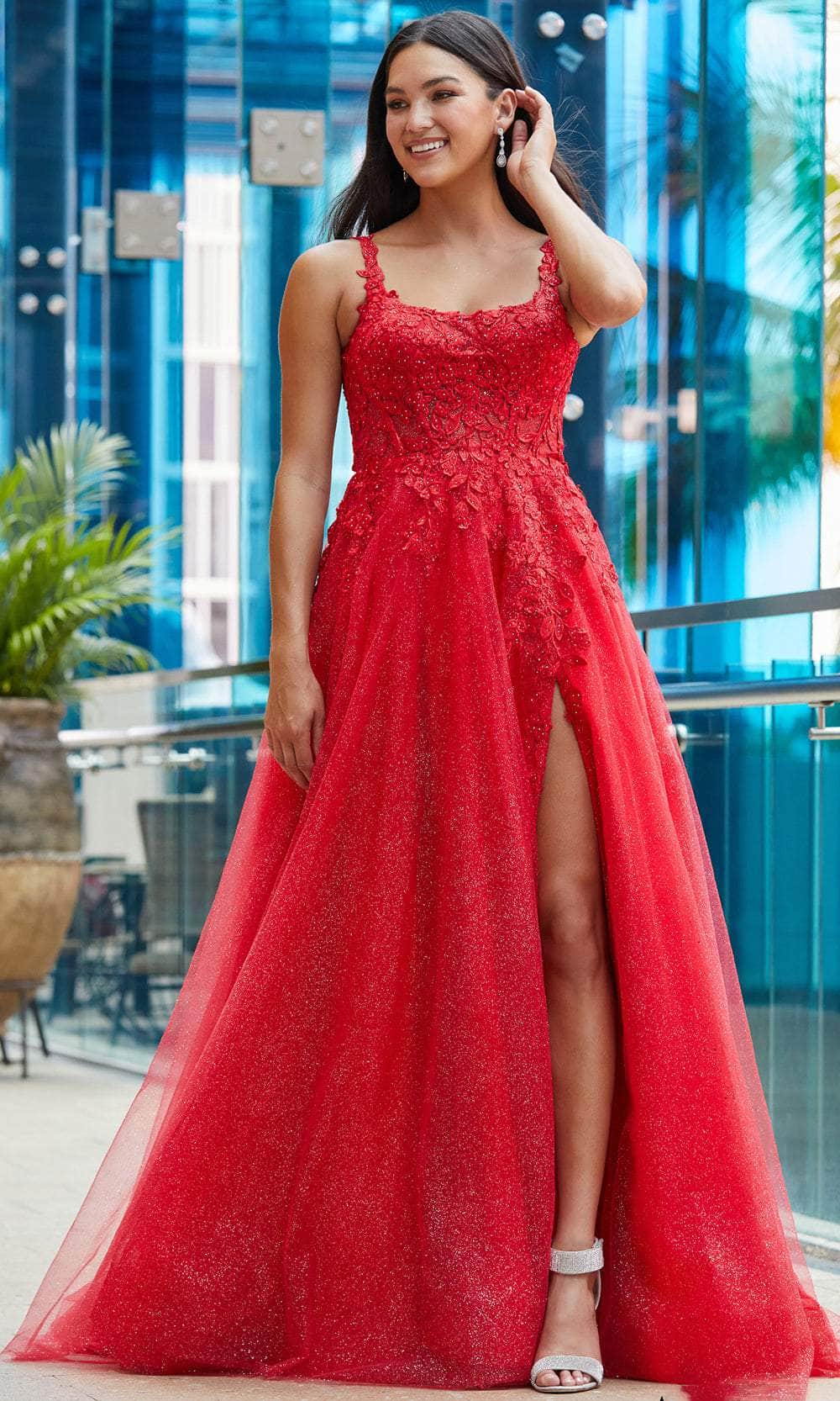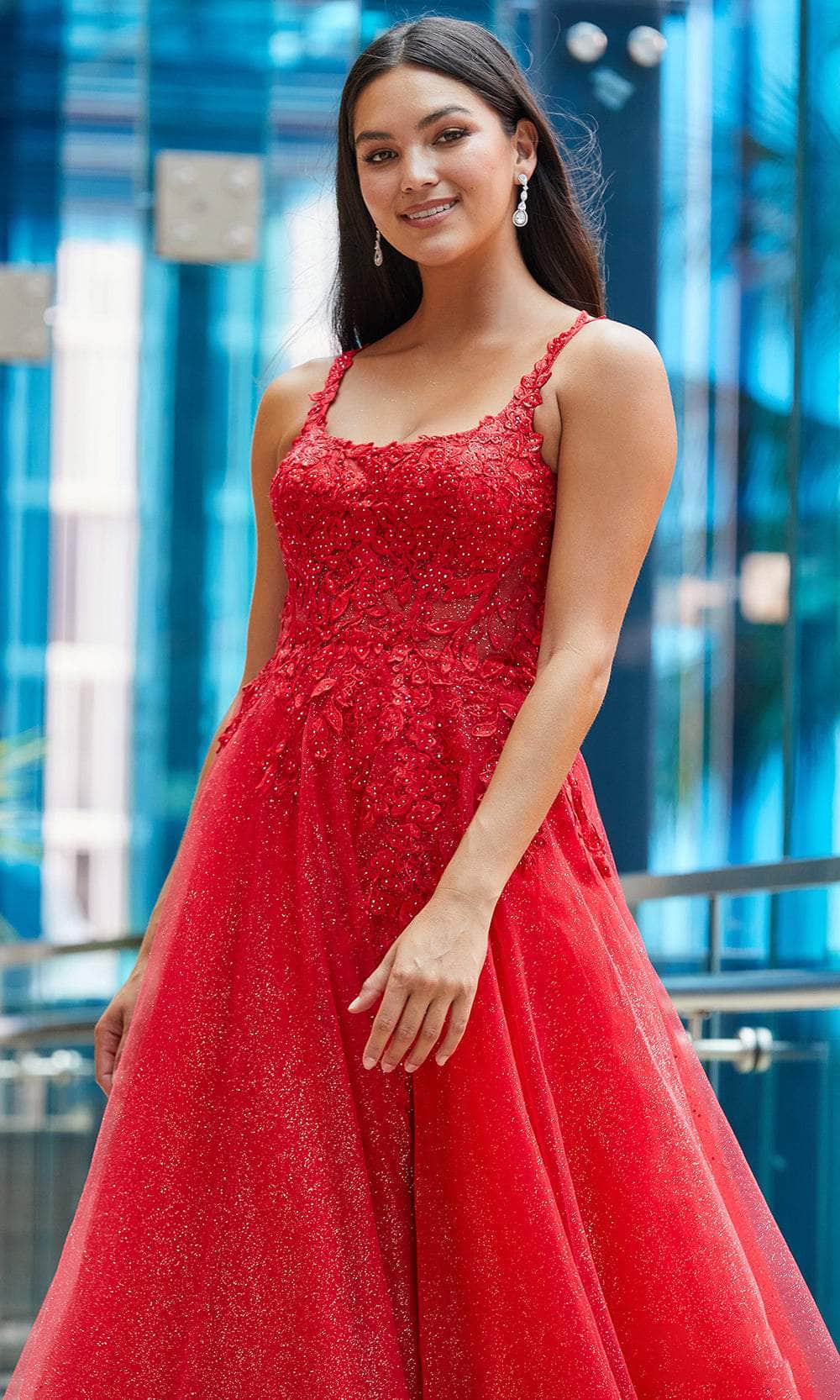 Enter the party and do that walk of a regal beauty in Amarra 88515. Features a unique combo of square neckline and sleeveless bodice while shimmering due to all the litters applied on this dress. Has evident floral embroidery along the top that crawls down to the upper part of the skirt. Made with tulle fabric and then flares in an A-line silhouette with a slit. Radiate a fresh style as you orchestrate a dramatic entrance in this radiant Amarra 88515. Model is wearing Red color.