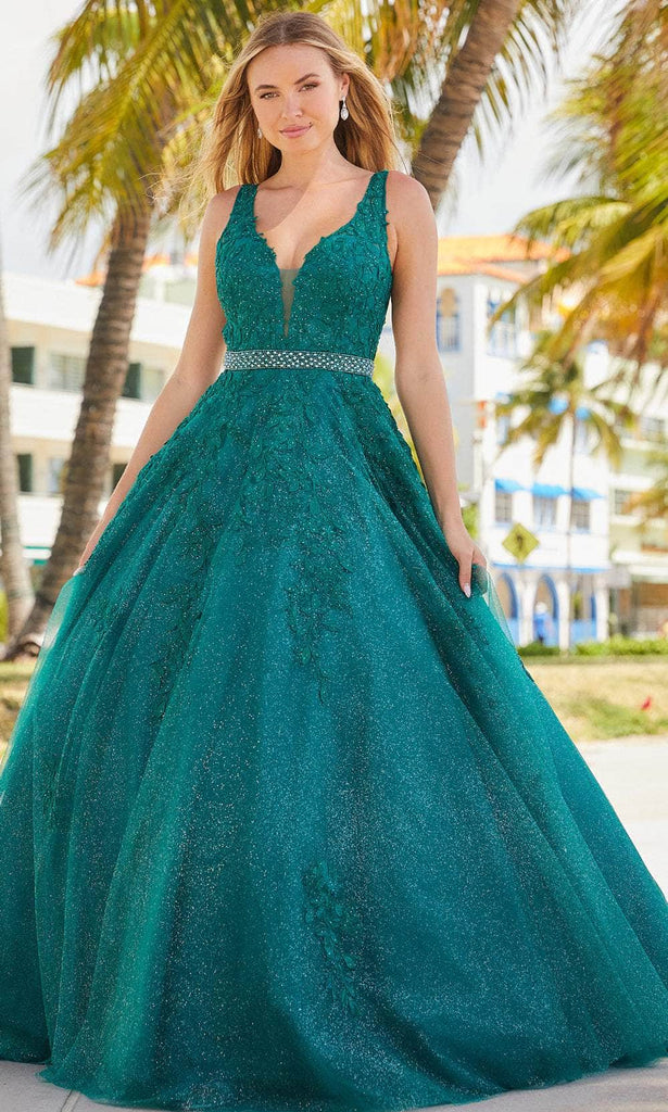 Make that monumental entrance into that lavish ballroom in this Amarra 88523 creation. Crafted in a glitter accent rendering allover its length, this gown reveals a v-neckline with supporting straps. Beaded waistband draws attention to your sexy, natural curves. Appliques trail down the bodice as it gradually fades to the skirt. Designed with a sweep of train, exquisite tailoring adorn the full-length ballgown silhouette. Make your personal fairy tale come true in this embellished Amarra 88523 masterpiece. Model is wearing the Emerald color.