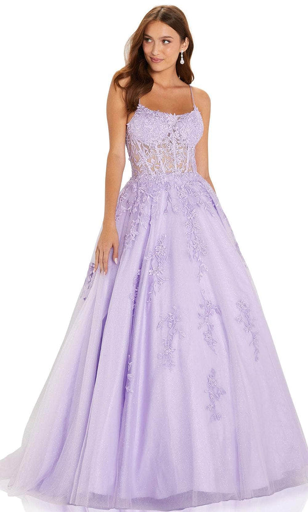 Look fantastic for your next special event in this creation by Amarra 88584. Charms in a scoop neckline, this winning piece is gorgeously embellished with leaf lace embroideries. The sheer corset-style bodice is held up by thin straps that lead to a crisscross back and lace-up tie. The scoop neckline is a lovely touch. The full-length skirt has a ballgown silhouette and a back sweep train. This Amarra 88584 design is a classic look that works for many special occasions. Model is wearing Lilac color.