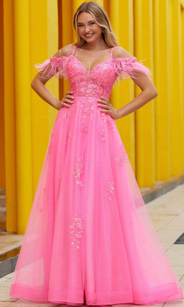 Capture the glamour as you walk in this stunning look from Amarra 88597. Featuring a sweetheart neckline and cold shoulder style, a fitted bodice, and sultry open back, this long dress is both fashionable and flattering. With embroidered lace, the corset bodice is exquisitely crafted to a trendsetting look. The A-line skirt is fashioned with layers of tulle as it falls to a sweep train finish making it ideal for a prom, formal, or gala event. Mesmerize the crowd with your sophisticated flair in this Amarra 88597 masterpiece. Model is wearing the Neon Pink color.