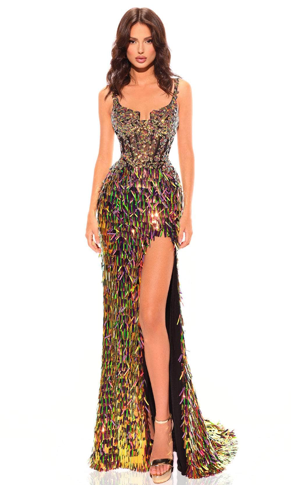 Look stunning in this seductive Amarra 88826 evening gown. This dress features a fitted, sleeveless bodice with a scoop neckline. Its top features an illusion design and thin straps that hold up the dress. The back features a lace-enclosed mid-open back. The entire dress is adorned with sequins, with floral motifs on the bodice and sequin fringe on the skirt. The full length of this sheath-silhouette outfit is adorned with a sweep train and an alluring slit. This Amarra 88826 is perfect for a standout style and flawless fit. Models are wearing Emerald, Gold/Multi, and Purple/Multi colors.