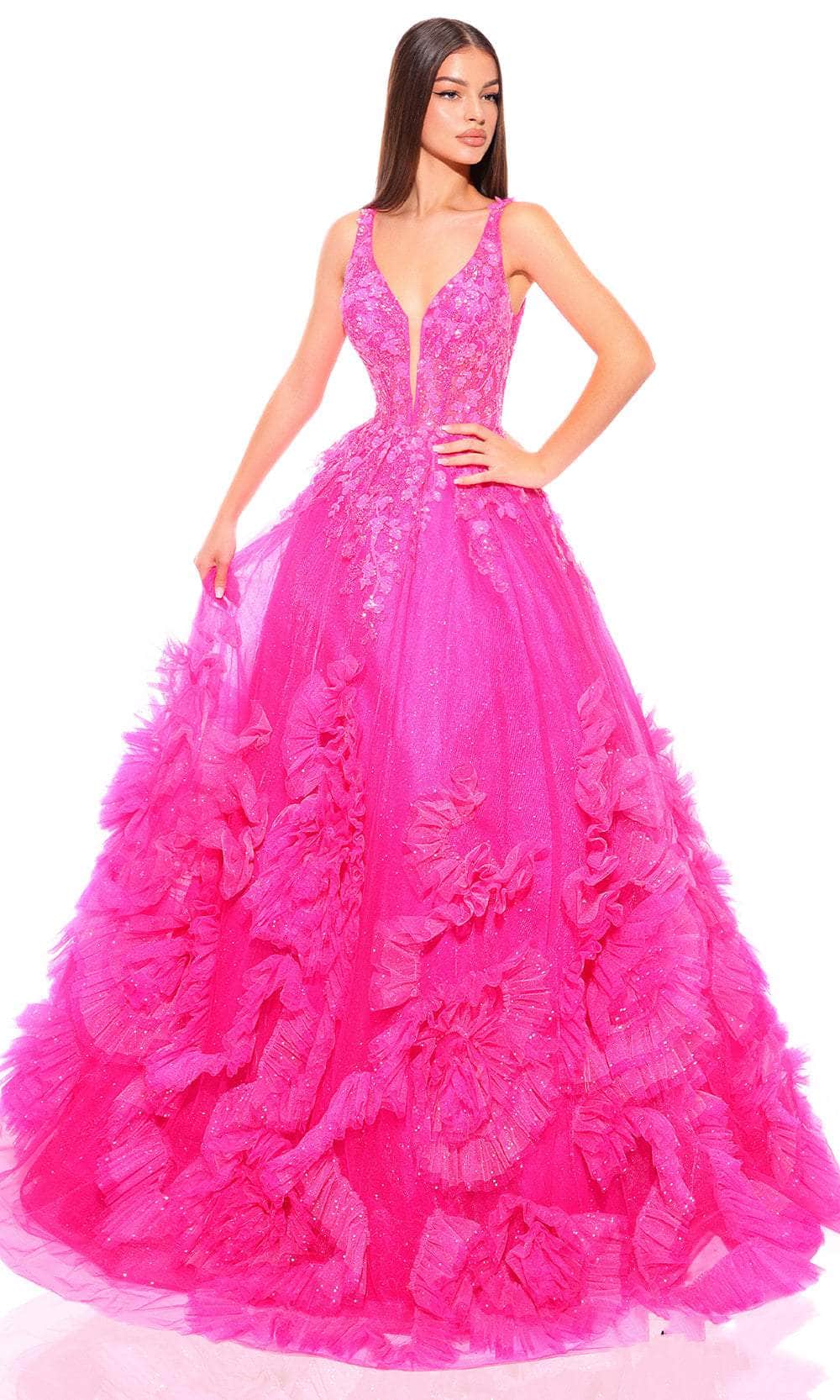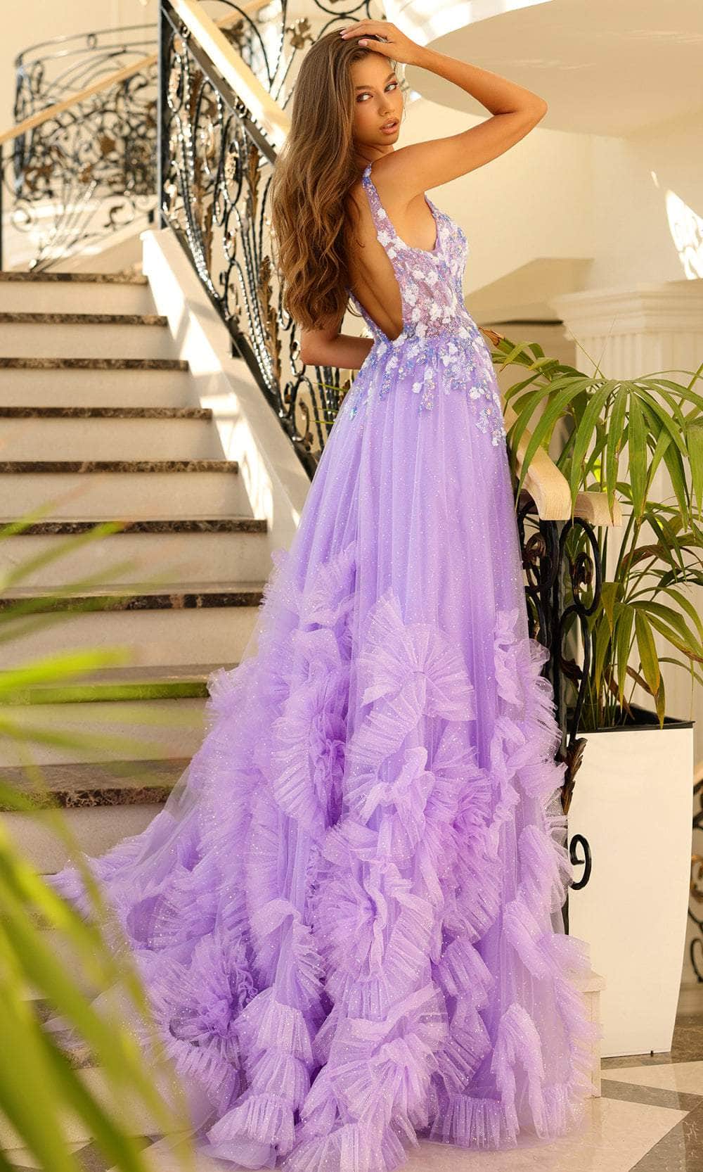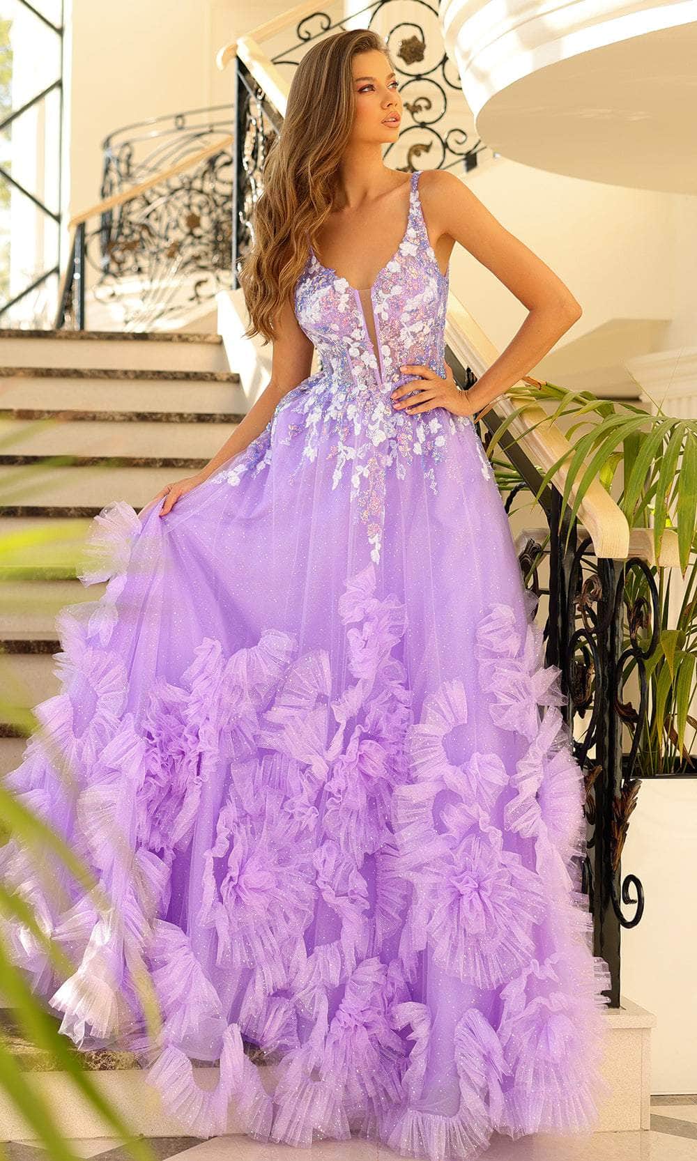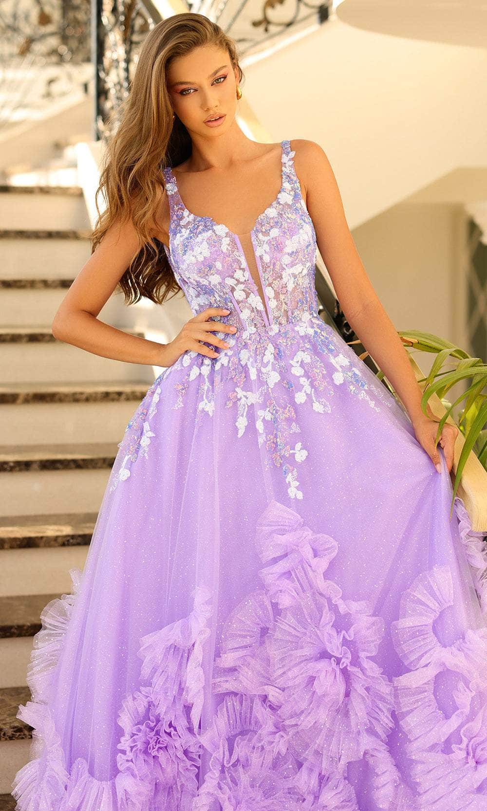 Amarra 88880 is a work of art composed of exquisite shimmering tulle embellished with floral appliques that perfectly compliment the entrancing design. It transports you to a whimsical paradise. The deep central plunge of the V-shaped neckline creates a seductive and enticing impression. The gown's attractiveness is enhanced with a frilled glittering tulle hem, which gives it a whimsical princess-like quality. As you enter a room, the sweep train exudes excitement and the low open back lends a hint of romance. The dress falls into a lovely ballgown silhouette, highlighting the wearer's physique with a Basque waistline. Discover a fantasy realm with this majestic Amarra 88880, appropriate for any event. Models are wearing Fuchsia/Multi and Lilac/Multi colors.