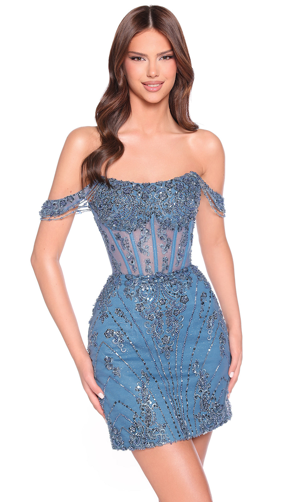 Prepare to dazzle in Amarra?88900, a show-stopping short dress that unmistakably commands attention. This piece features off-shoulder sleeves paired with a sculpted corset bodice reinforced with structured boning for impeccable fit. The intricate beadwork and embroidery cascades across the tulle canvas, illuminating every curve with shimmering detail under the lights. A sweetheart neckline and open back adds a hint of sultry sophistication. Make your next special occasion unforgettable with Amarra?88900 sheath dress. Models are wearing Black, Champagne, and Teal colors.