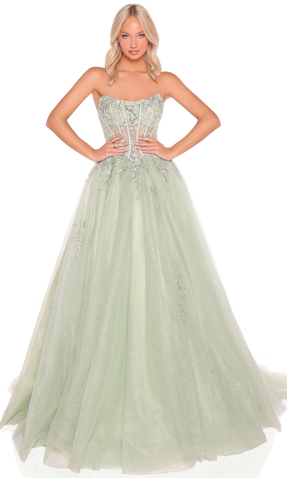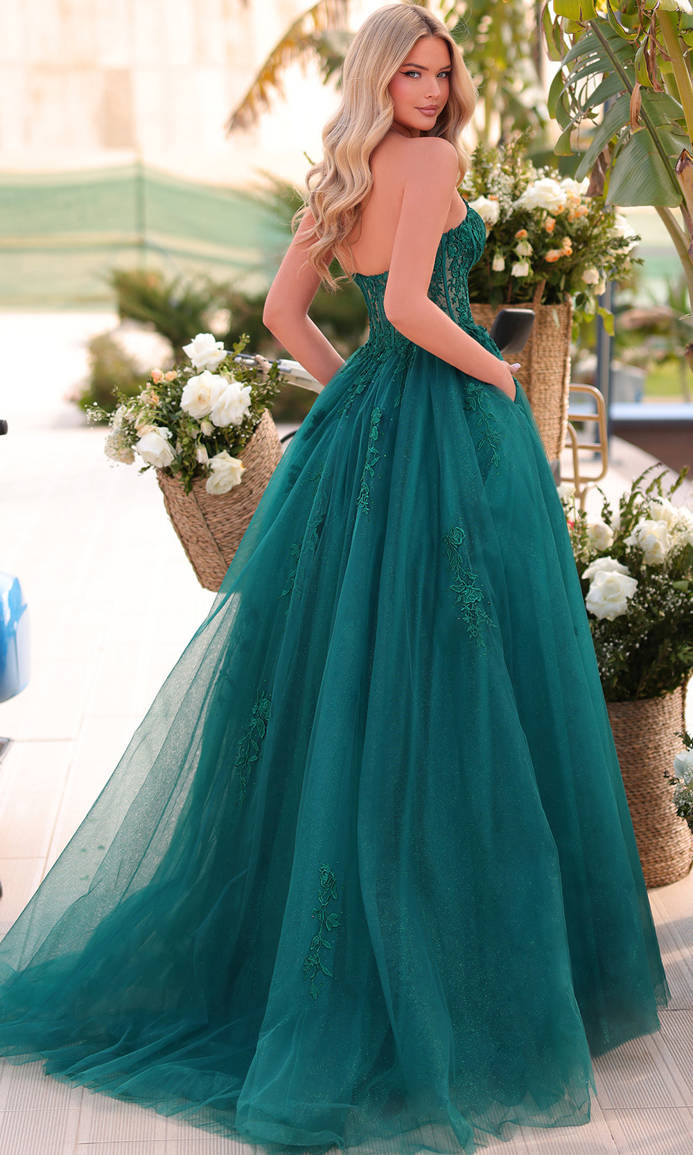 Radiating whimsical charm, this Amarra 88913 stunning ballgown delivers a fairytale silhouette with a modern twist. The sheer corset bodice is accentuated by detailed floral embroidery, combining texture and elegance. Layers of glitter tulle create volume and light-catching movement, making every step sparkle. The lace-up back ensures a flawless fit, while the strapless scoop neckline softens the look with timeless appeal. Amarra 88913 is your go to piece for evenings that demand enchanting design and graceful form. Models are wearing Black, Emerald, and Sage colors.