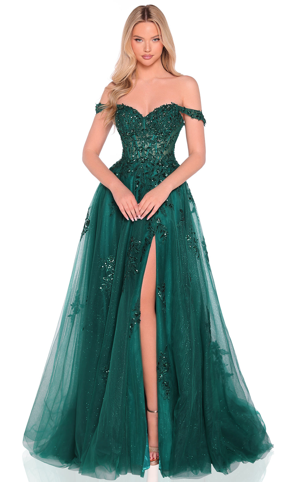 Effortless elegance and sparkling drama come together in this Amarra 88938 unforgettable ballgown with a bold slit and off shoulder detailing. The sweetheart neckline transitions into a structured corset bodice, accentuating the waist and sculpting the silhouette. Sequins and floral lace appliques are intricately embellished across the surface, adding brilliance and depth to the flowing tulle. Delicate straps rest softly off the shoulders, creating a romantic profile. Amarra 88938 is the ultimate choice for any special occasion that calls for grace and luminous sophistication. Models are wearing Emerald, and Navy colors.