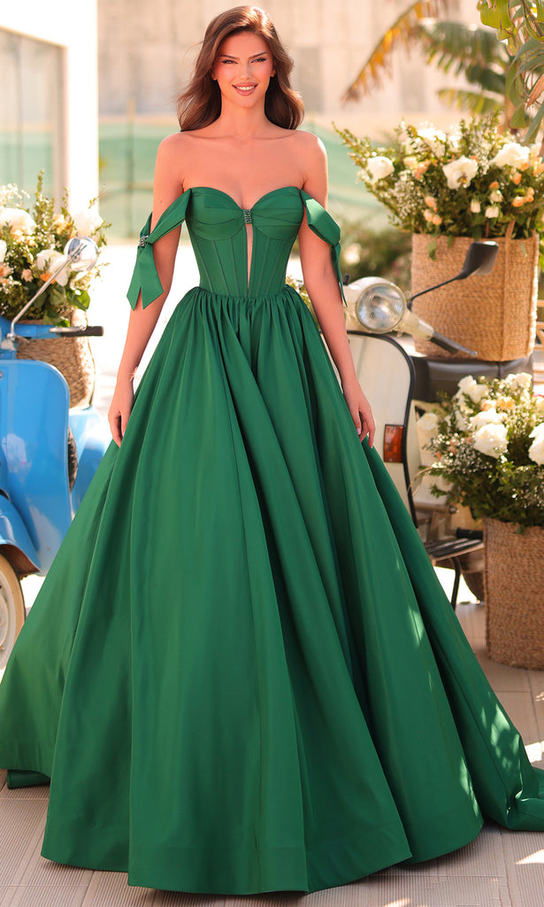 A true standout in every crowd, Amarra 88995 captures the essence of red carpet glamour with its expertly tailored satin construction and flattering natural waistline. The design includes a lace-up corset back that sculpts the figure, an illusion plunging sweetheart neckline for added allure, and ribbon-adorned off-shoulder sleeves for a whimsical accent. Perfect for twirling under venue lights, the full gathered ballgown skirt commands attention while providing graceful movement. Whether attending your prom, homecoming, or a grand gala, the Amarra 88995 will transform you into the event most elegant attendee. Models are wearing Emerald, Fuchsia, and Royal Blue colors.