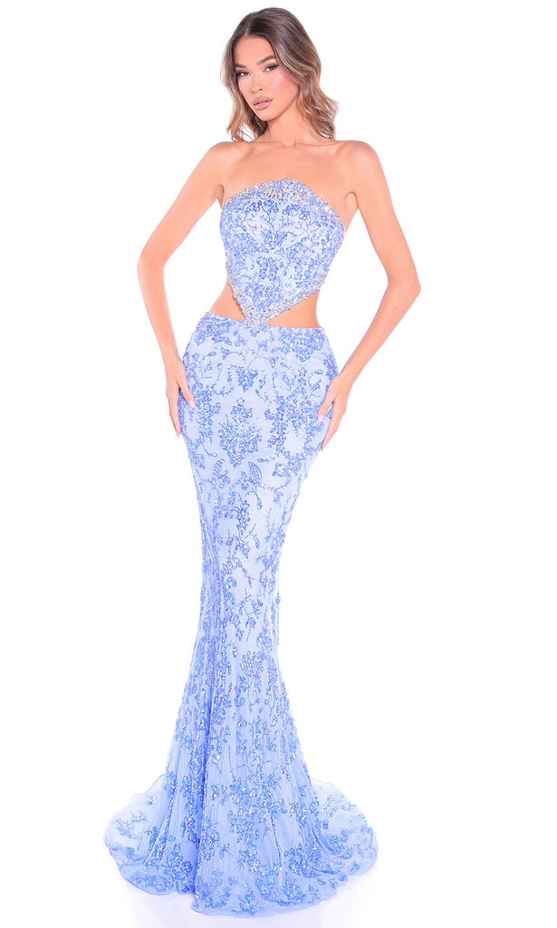 A distinct energy surrounds Amarra 89095, effortlessly balancing bold design with timeless beauty. The fitted strapless bodice showcases the body natural form, complemented by elegant side cutouts that reveal subtle contrast. Intricate beaded embellishments shimmer with depth and light, creating movement through every glance. The sheath skirt adds drama to each stride, highlighting shape and motion. Amarra 89095 transforms moments into memories, merging poise and power into one stunning creation. Models are wearing Gold, Ivory/Gold, Ivory/Light Blue, and Periwinkle/Silver colors.