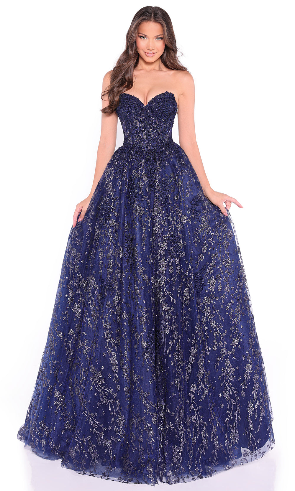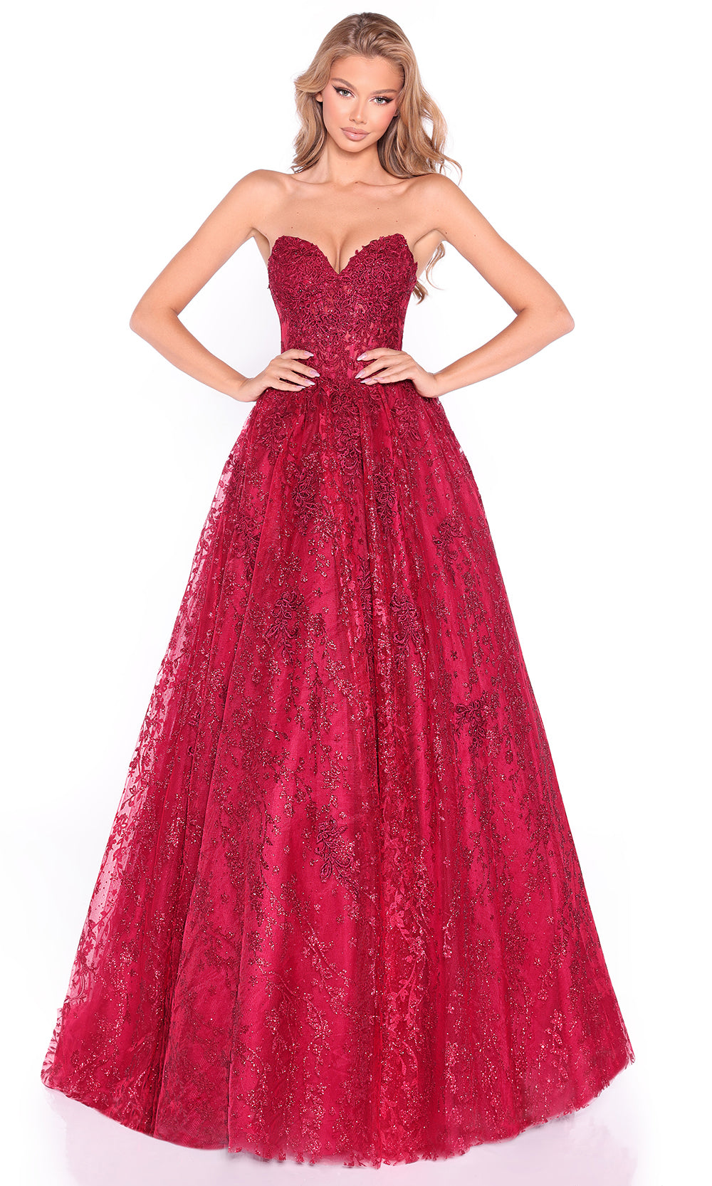 The Amarra 89427 transforms classic design into a vision of romance and refinement. Its strapless sweetheart bodice offers a timeless silhouette, while delicate embroidery weaves intricate floral patterns across the gown. A cinched waist accentuates the figure before flowing into a voluminous ballgown skirt that commands attention. Soft shimmer and texture create a regal finish, perfect for statement entrances. The Amarra 89427 is the ultimate choice for prom occasions where elegance and grace take the spotlight. Models are wearing Emerald, Navy, and Wine colors.