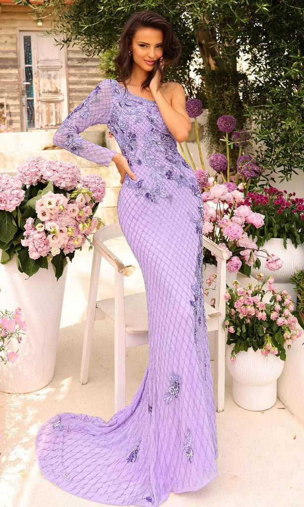 | Details: | Fitted, One Shoulder Long Sleeve, Floral Sequin Embellished, Floor Length, Sweep Train |