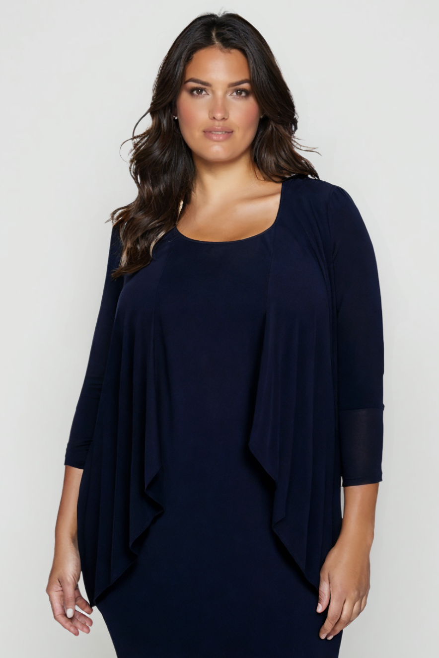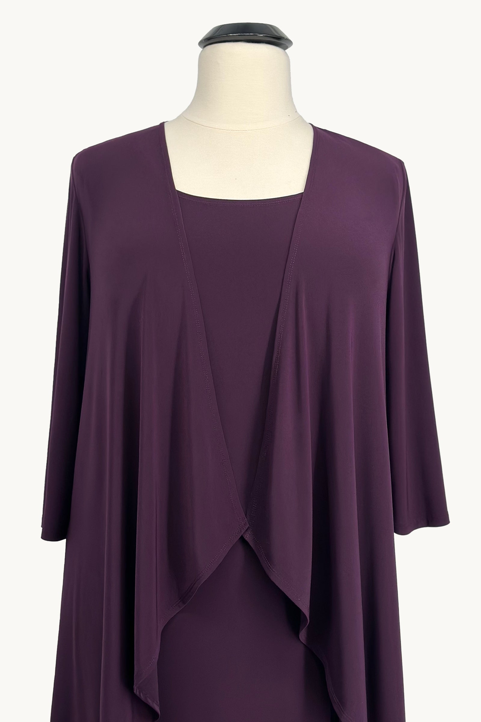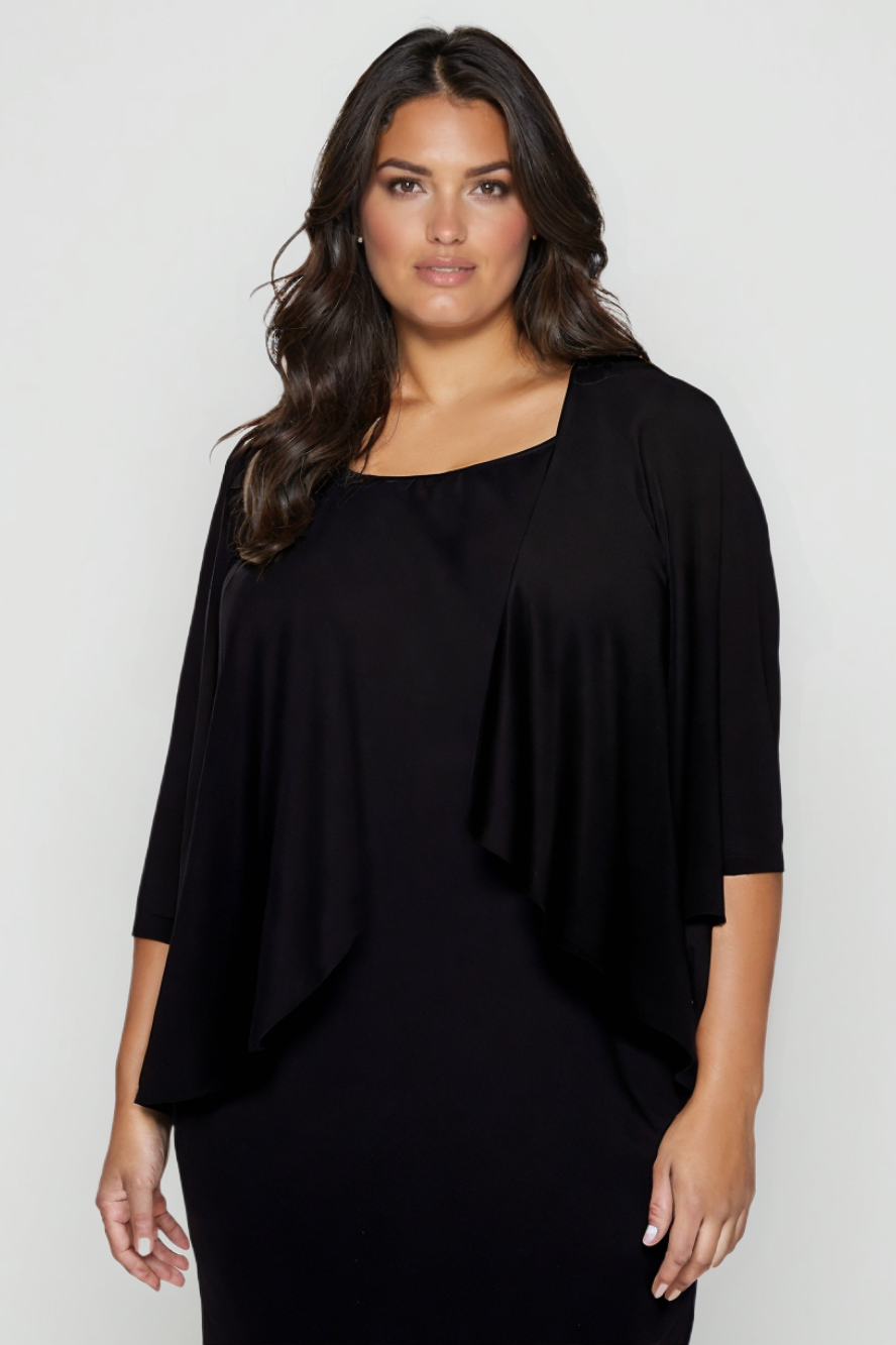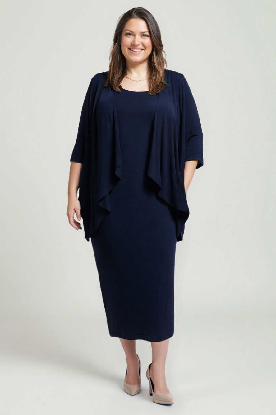 Honor refinement in Amoris by Ladivine T9000, a mother-of-the-bride ensemble crafted for timeless appeal. The sleeveless tea-length dress is styled with a scoop neckline and tailored simplicity, while the coordinating open-front jacket adds elegance with quarter sleeves and a cascading drape hem. Ideal for weddings, receptions, or formal evenings, Amoris by Ladivine T9000 offers effortless sophistication in a versatile two-piece design. Models are wearing Black, Eggplant, and Navy colors.