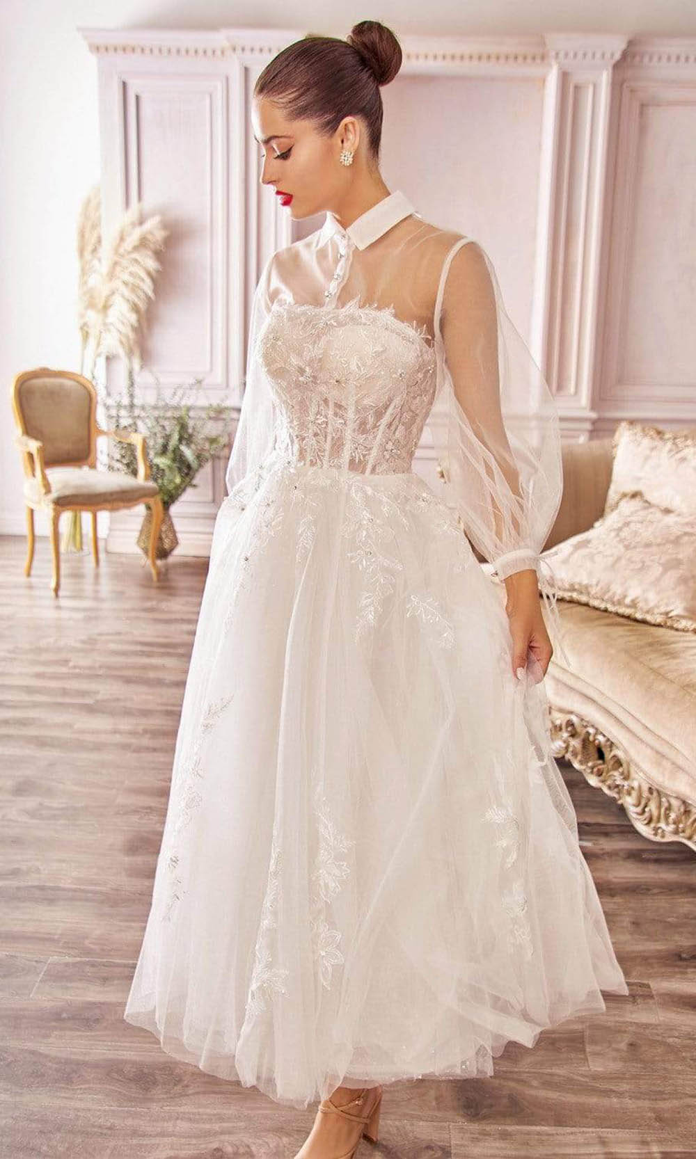 Andrea and Leo A1016 collared embroidered lace tulle cocktail dress showcases a sheer yoke and bishop sleeves, a corseted bodice, and a semi-sheer back with glass button accent. This elegant dress is cut in a tea-length A-line silhouette using tulle fabric. The Andrea and Leo bridal dresses are no less than the dresses in your dreams. If you have always wanted to feel like a princess, this is your time! Model is wearing Off White color.