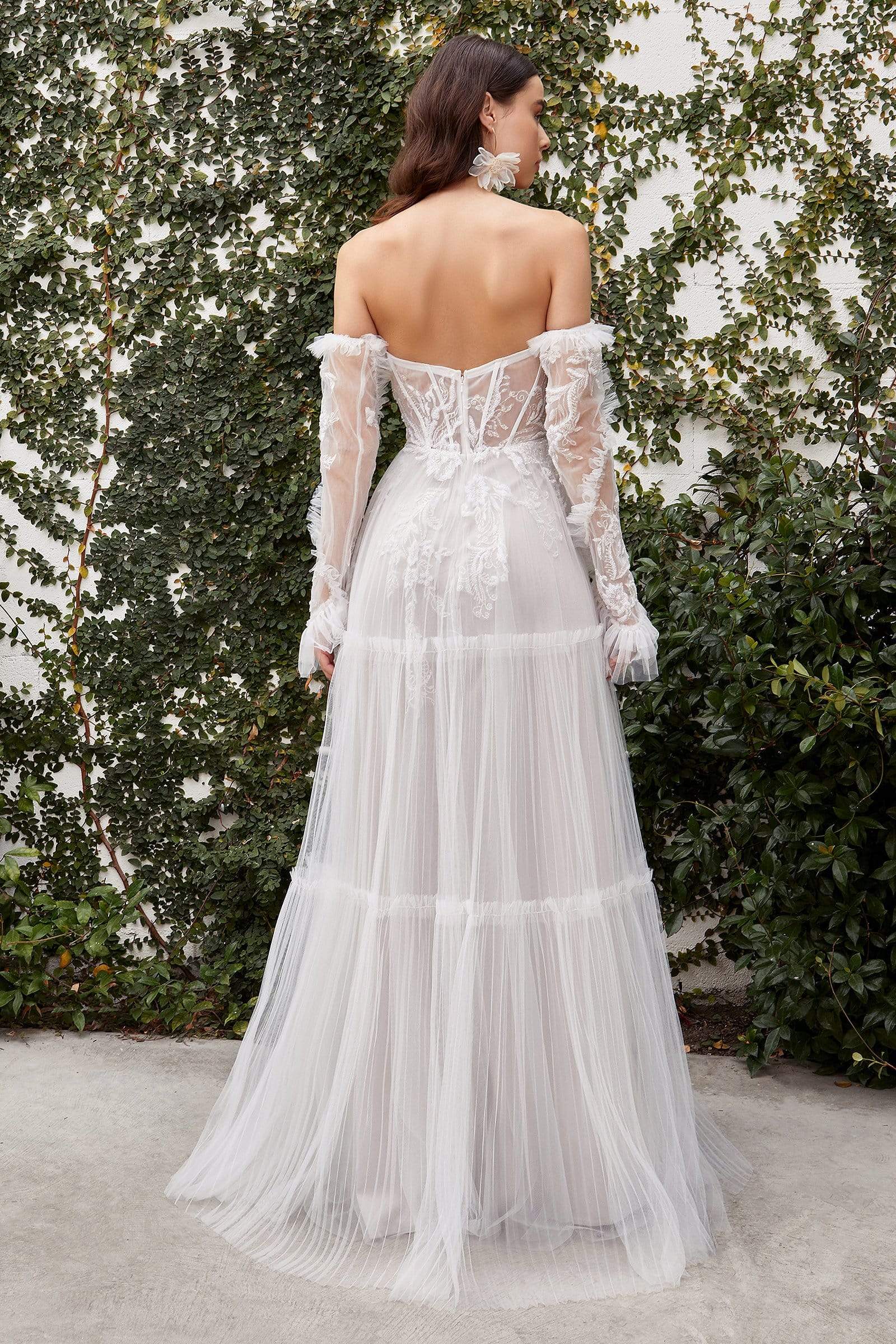 | Details: | Strapless, Sheer Detachable Sleeves, Embroidered Details, Corset Bodice, Sheer Back, Zipper Closure, Sweep Train |