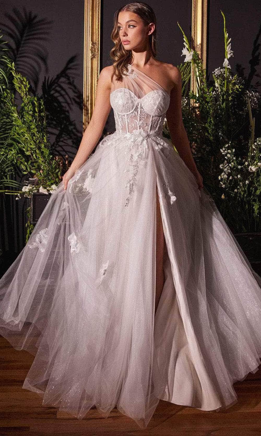 Capture timeless elegance in the Andrea & Leo A1053W bridal gown, a stunning choice for your wedding day. This long off-white dress features exquisite floral embroidery, elevating its allure with intricate detail. The one-shoulder design adds a modern twist, ensuring you're selfie-ready from every angle. The bodice boasts a sheer corset adorned with lace floral applique, evoking romance and femininity. Completing the look is a layered tulle skirt that adds volume and movement, enhanced by a playful small leg slit. Whether your wedding is formal or informal, this A-line bridal gown guarantees you'll feel beautiful and confident on your special day. Experience bridal bliss with Andrea & Leo A1053W. Model is wearing the Off White color.