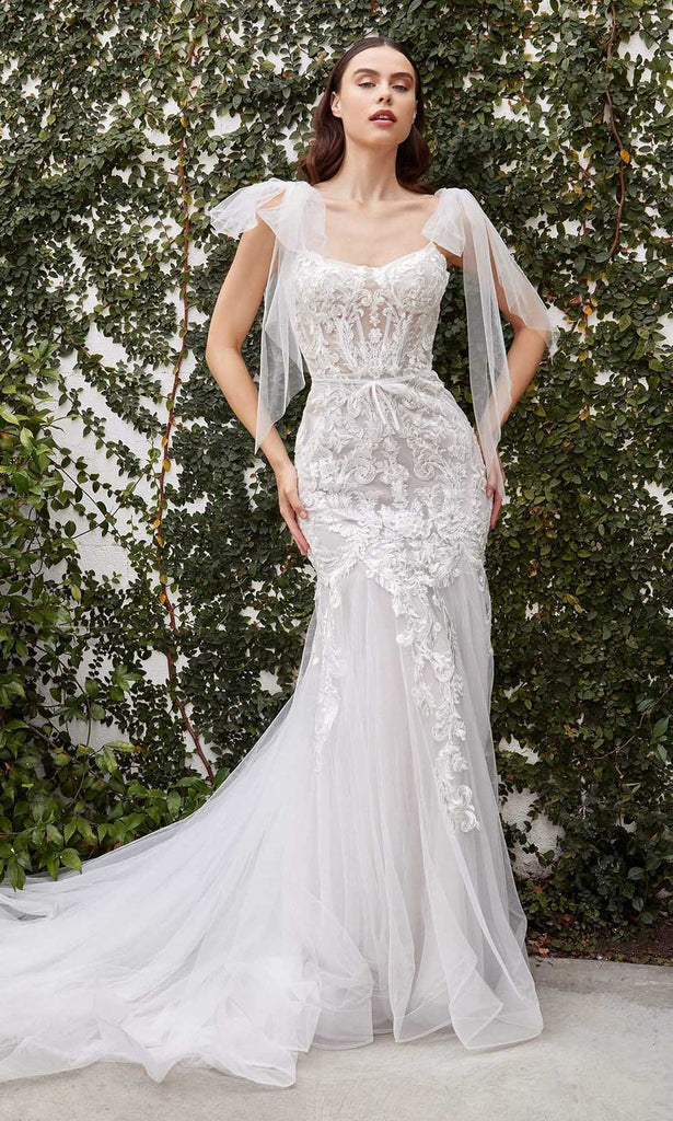 Make that entrance memorable as you walk to the altar in this Andrea and Leo A1086W creation. Beaded and embellished with lace applique details, this sheer corset gown features a sweetheart neckline. Sheer bow drapes accent the thin straps. The mermaid skirt streams with adornments and flows with a train. Flourish stunning elegance in this Andrea and Leo masterpiece.