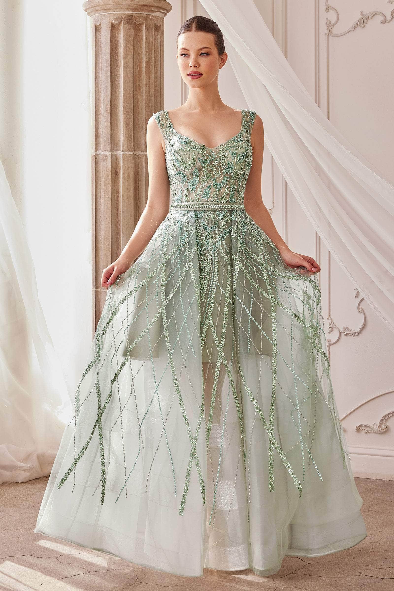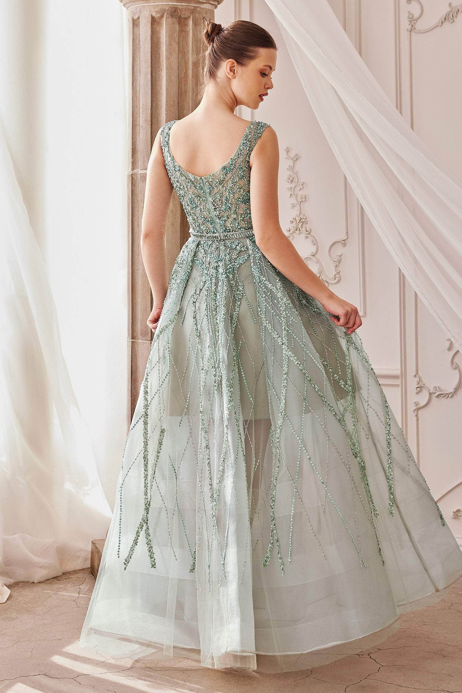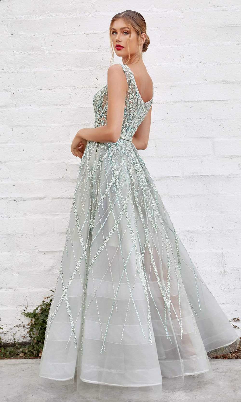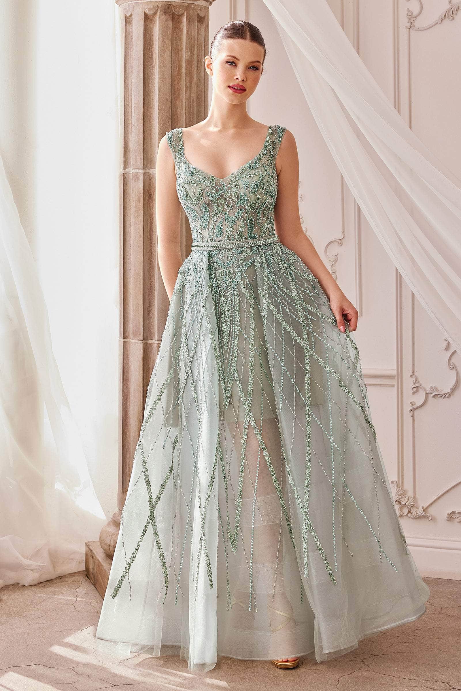 Hold them captivated with the beauty of this Andrea and Leo A1091 creation. Flatteringly ornate with intricate beadwork on a sleeveless bodice, this gown shows a v-neckline with a v-open back, Embraced with an embellished waist, the lattice ornate skirt flares into a floor length hemline. Never waver from the limelight in this Andrea and Leo masterpiece.