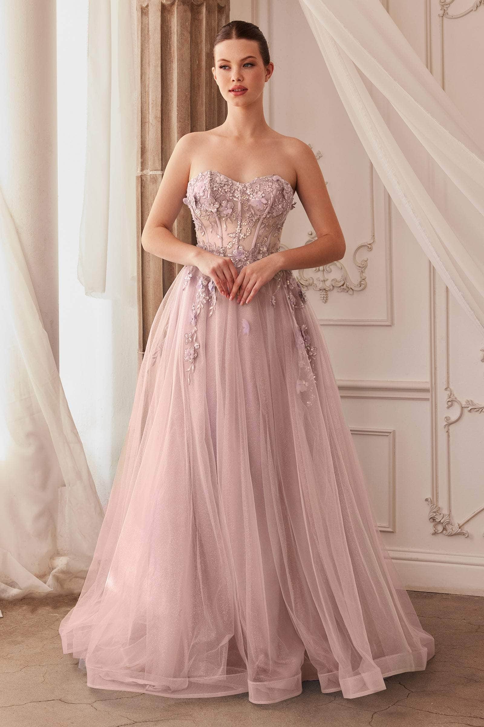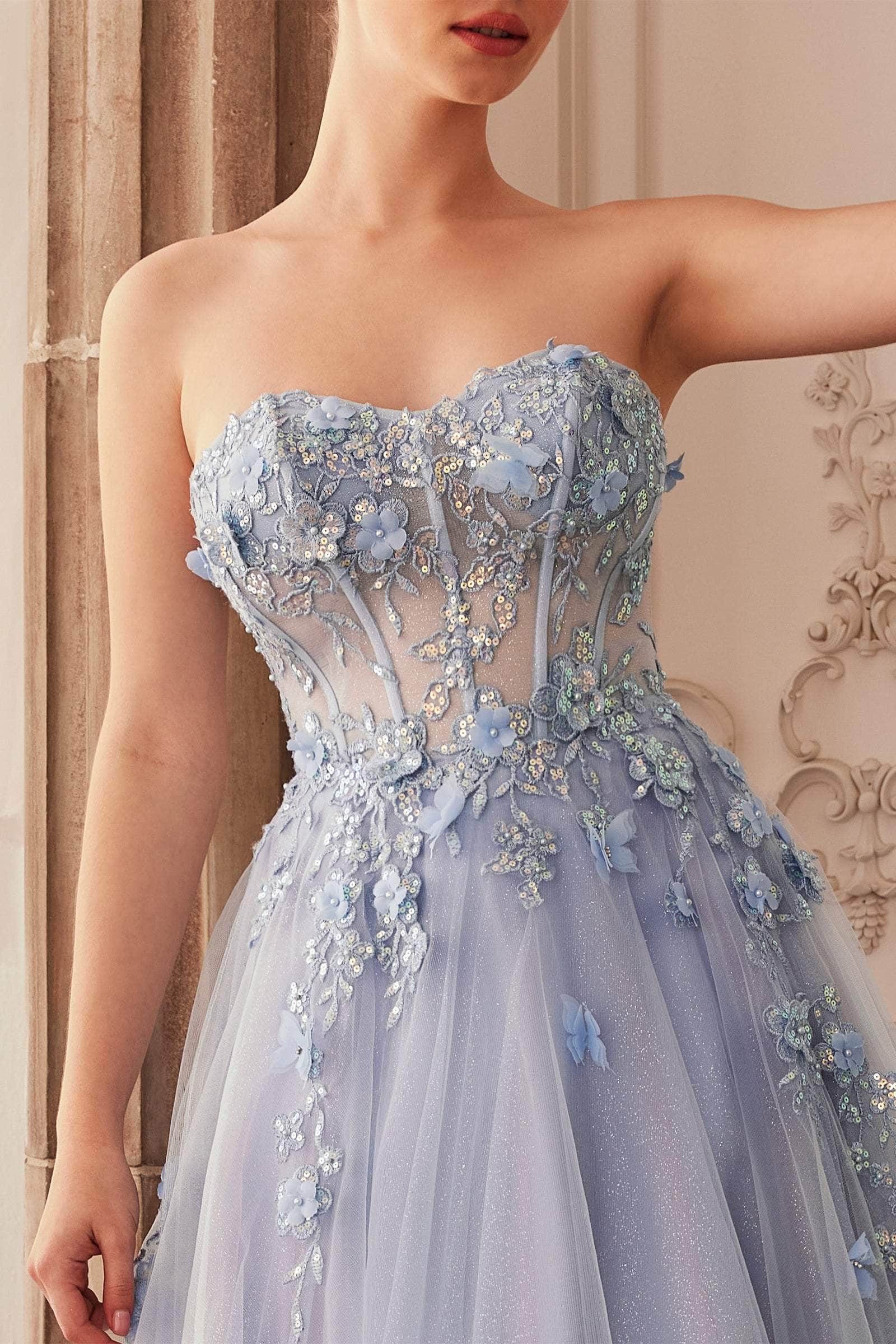 Make an extraordinary statement when you walk in this classy Andrea and Leo A1108 creation. Ornamented with exquisite embroidery and beading with butterfly & floral appliques. This breathtaking strapless gown offers an illusion boned bodice topped by a sweetheart neckline and low cut back. The matching detachable puffed sleeves bring drama and create a two-way look. From the natural waist, the glitter tulle skirt flares a voluminous ballgown silhouette in a full length hem and ends in a sweeping train. Turn yourself into a timeless beautiful goddess in this gown by Andrea and Leo A1108. Models are wearing the Lavender, Paris Blue and Tea Rose colors.