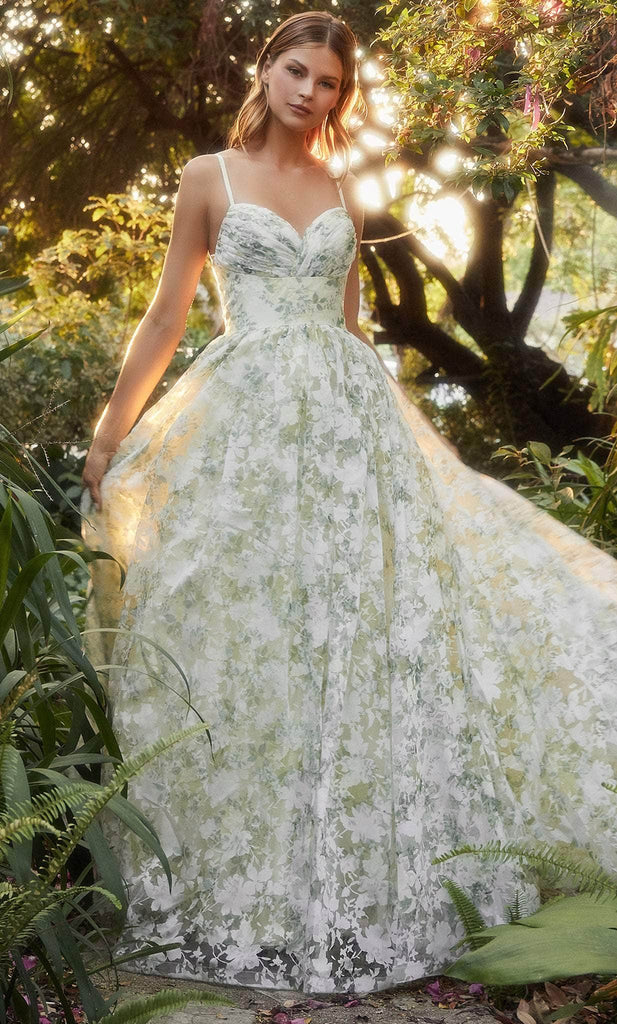 Float into that spectacular ballroom like an ethereal vision in this inspired Andrea and Leo A1132 creation. Flourishing a spectacle of floral print embellishments on a gossamer organza silhouette, this beauty charms with a pleated sweetheart neckline hanging from spaghetti straps. Stringing with thin straps and weaved with a corset styled back, the skirt streams from a shirred waist as it falls to the floor with a sweeping denouement. Be the delight of the crowd while making such a mesmerizing entrance in this Andrea and Leo masterpiece. Models are wearing the Blue and Yellow colors.
