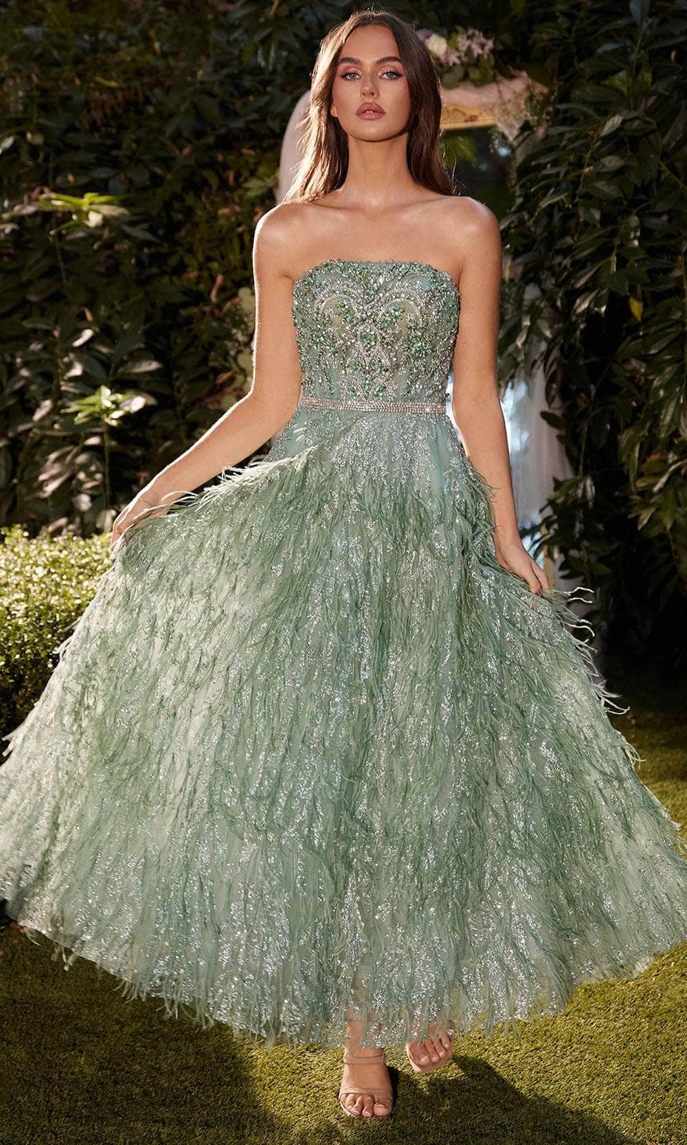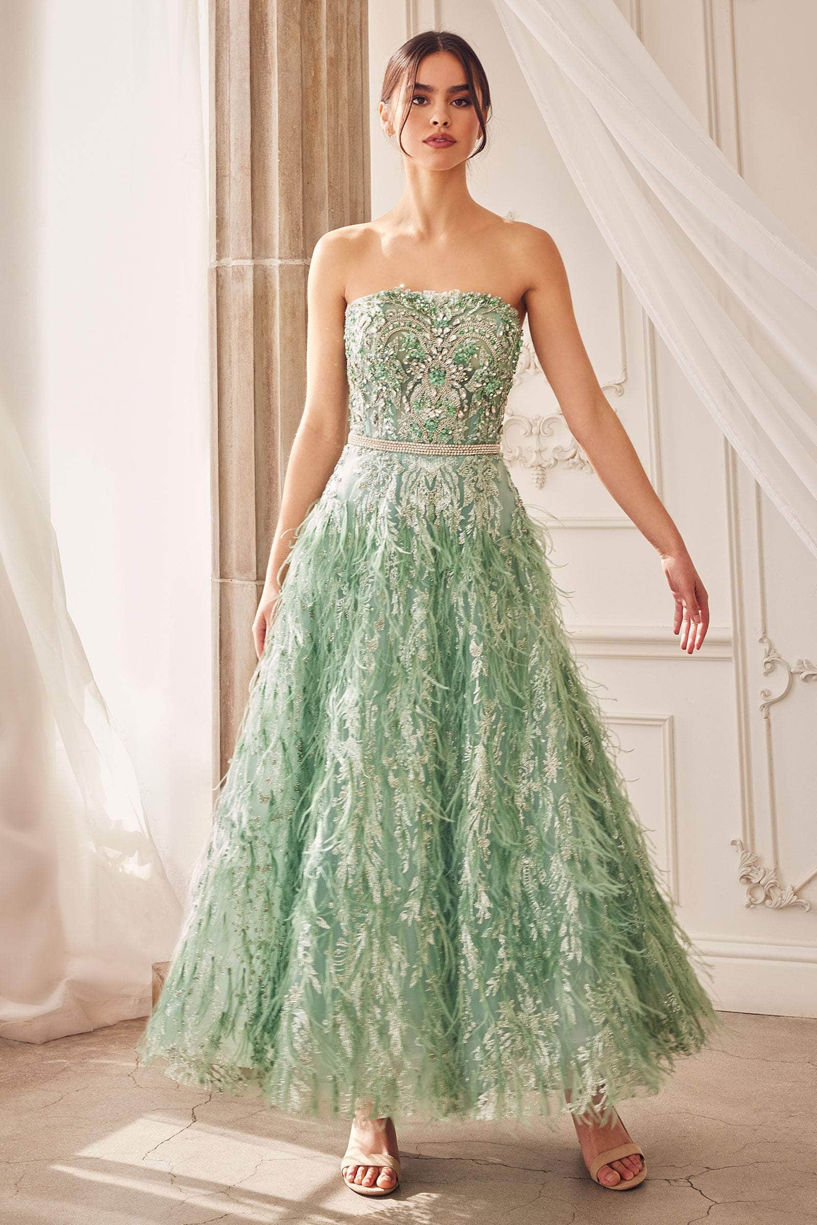 Embrace your inner fashionista in this Andrea And Leo A1226 creation. This strapless dress is a true showstopper, featuring a straight across neckline that highlights your beautiful collarbones. It is embellished with beaded and rhinestones adding a touch of glamour to your overall look. Additionally, the low open back has a zipper closure to ensure easy wear and a perfect fit. A thin belt cinches your waist, showcasing your feminine curves. Adorned with glittered feathers that exude grace and movement, the skirt flares out an A-line silhouette that glides to the tea-length hemline. This Andrea And Leo A1226 dress is an instant refresh for your eveningwear repertoire. Model is wearing Sage color.