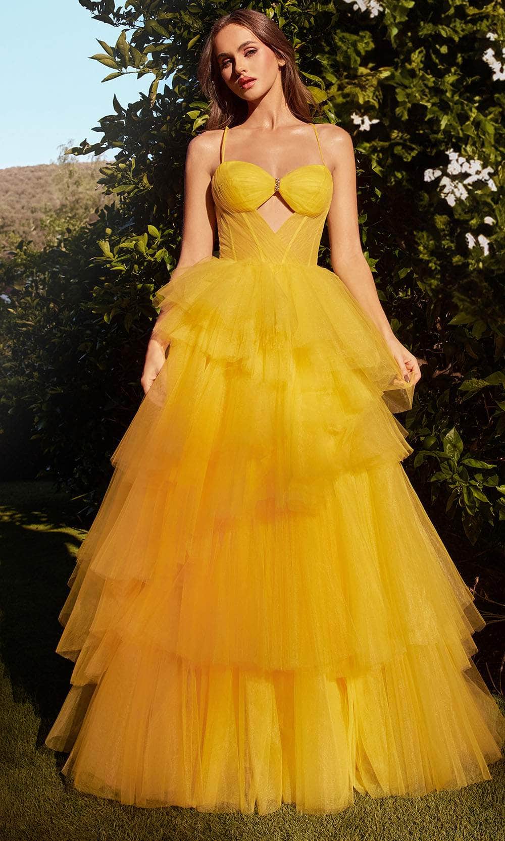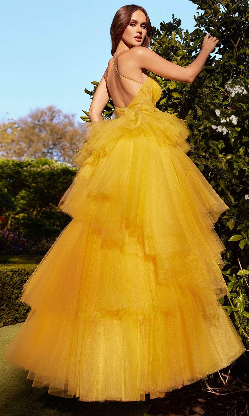 Let your inner diva shine as you flourish in this gorgeously crafted Andrea And Leo A1238 creation. This tiered ruffle gown is a tribute to romance and style. The fitted keyhole bodice is decorated with mesmerizing rhinestone detail. Delicate thin straps elegantly frame your shoulders, inviting you to dance through the captivating layers of an asymmetrical gathered-tiered skirt. Step into the magic and twirl through a garden of lively enchantment in this Andrea And Leo A1238 masterpiece. Models are wearing the Azalea Pink and Marigold colors.