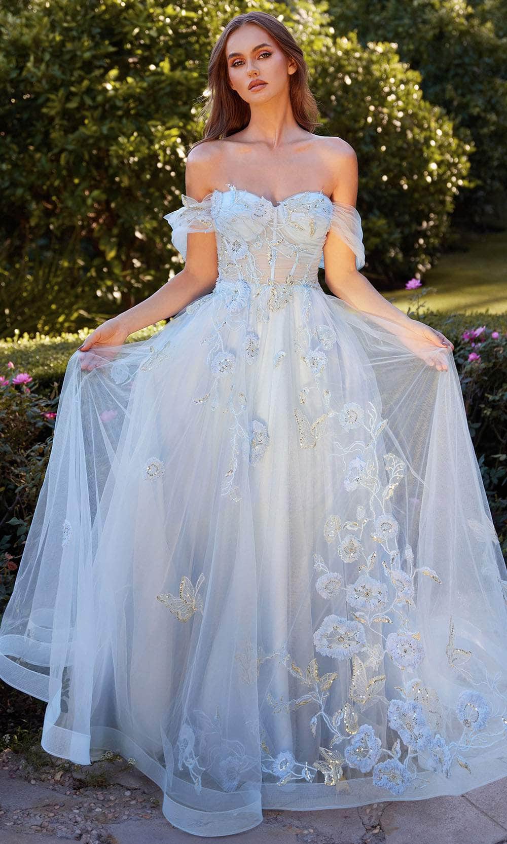 Indulge in the enchantment of this Andrea And Leo A1246 creation. Adorned with beaded, 3D floral, and butterfly applique, this dress truly makes a statement. Your shape is enhanced and given a chic touch by the ruched illusion corset bodice. It features a sweetheart neckline, draped off-shoulder sleeves and a mid-open back. The skirt makes an A-line silhouette that spills to a sweeping train and ends with a horsehair hem for a captivating movement. Be dressed up beautifully in Andrea and Leo A1246 gown. Model is wearing Dusty Blue color.