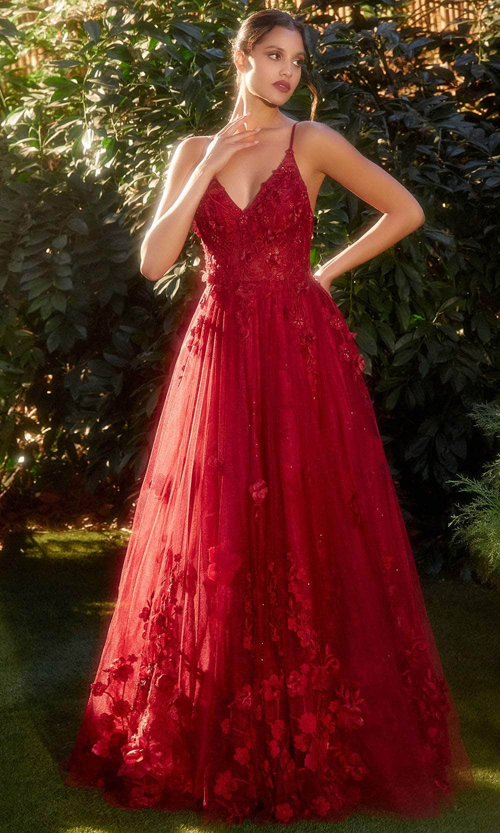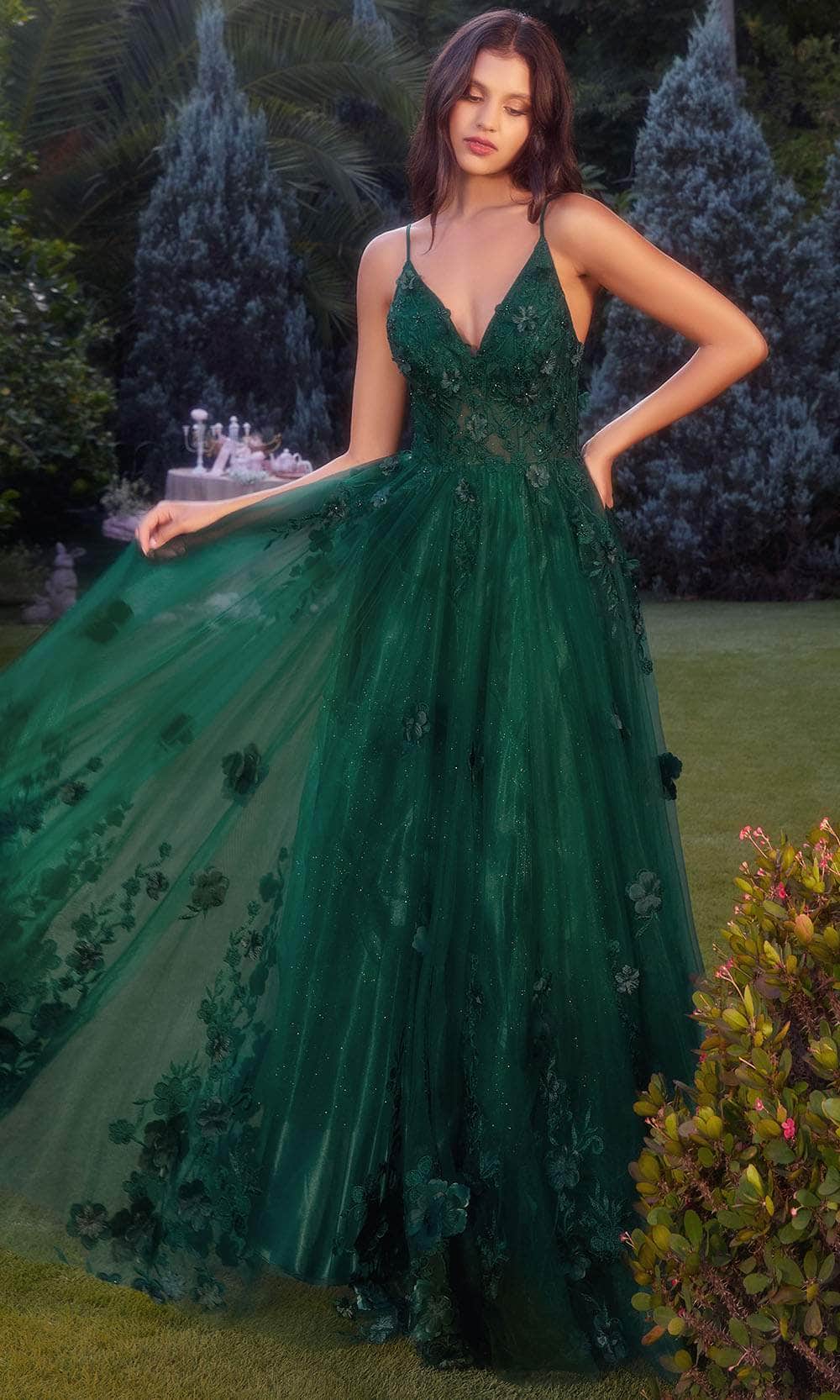 Embrace the epitome of luxury and style in this ingenious design from Andrea And Leo A1326. The tiered tulle skirt, adorned with three-dimensional floral appliques and rhinestone details, crafts a mesmerizing garden of enchantment that comes to life with each twirl. The v-neckline lace-appliqued bodice, cradled by delicate slender straps, stands as a timeless canvas of grace. Immerse yourself in the magic and witness the unfolding of floral dreams in Andrea and Leo A1326. Models are wearing the Burgundy, Emerald, and Navy colors.