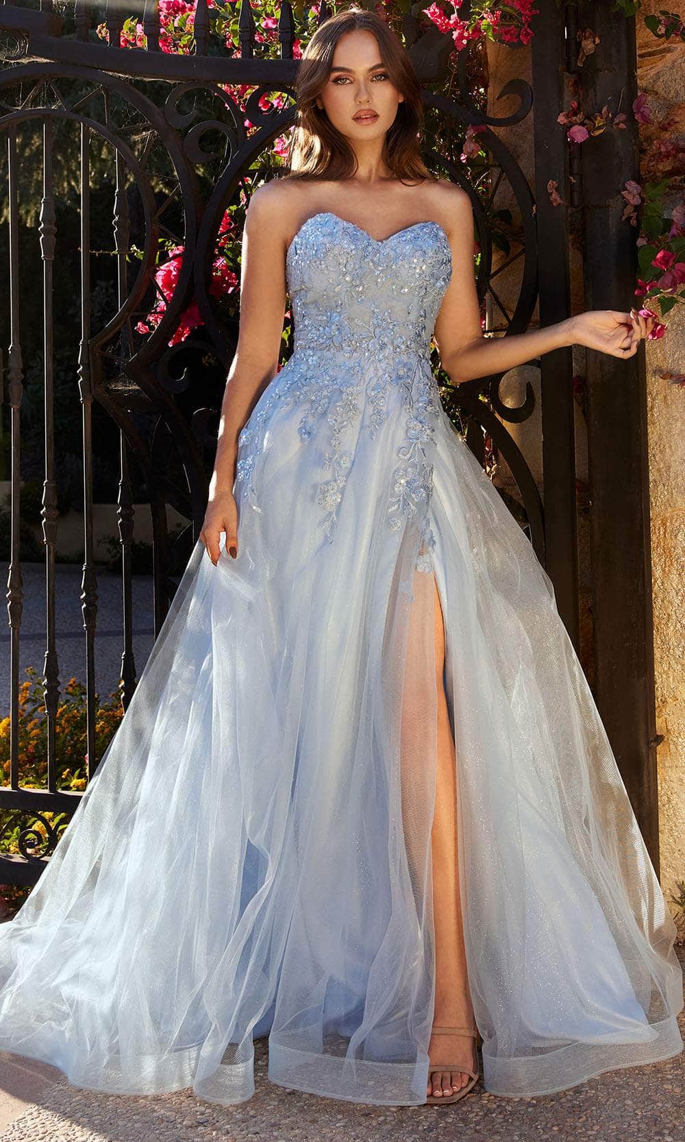 Indulge in classic beauty with this Andrea And Leo A1339 masterpiece. Expertly adorned with lace appliques and delicate beading, this strapless dress will make you stand out in the crowd and shine. It features a sweetheart neckline complemented by the illusion mid-open back. Revealing your legs with its front thigh-high slit, the skirt flawlessly crafts an A-line silhouette and drops to the majestic sweep train. This Andrea And Leo A1339 dress will make you feel like a true princess. Model is wearing Light Blue color.