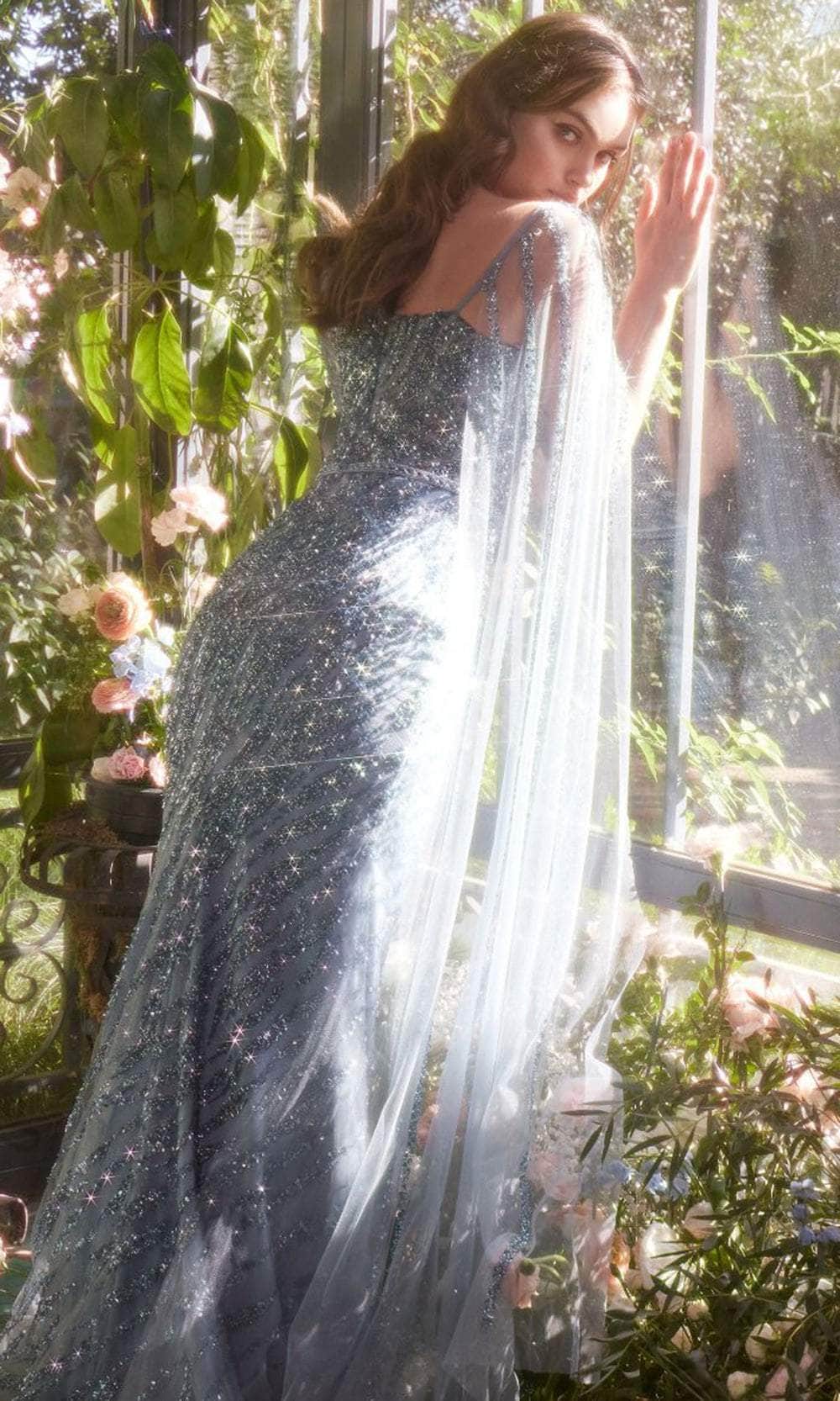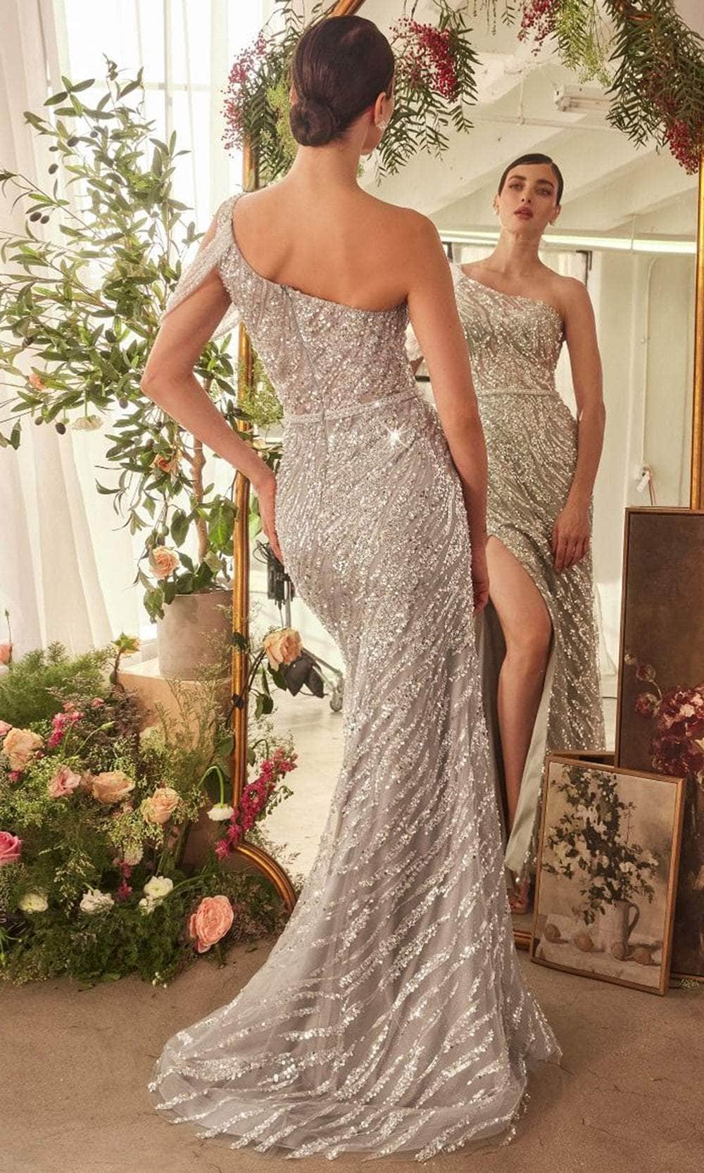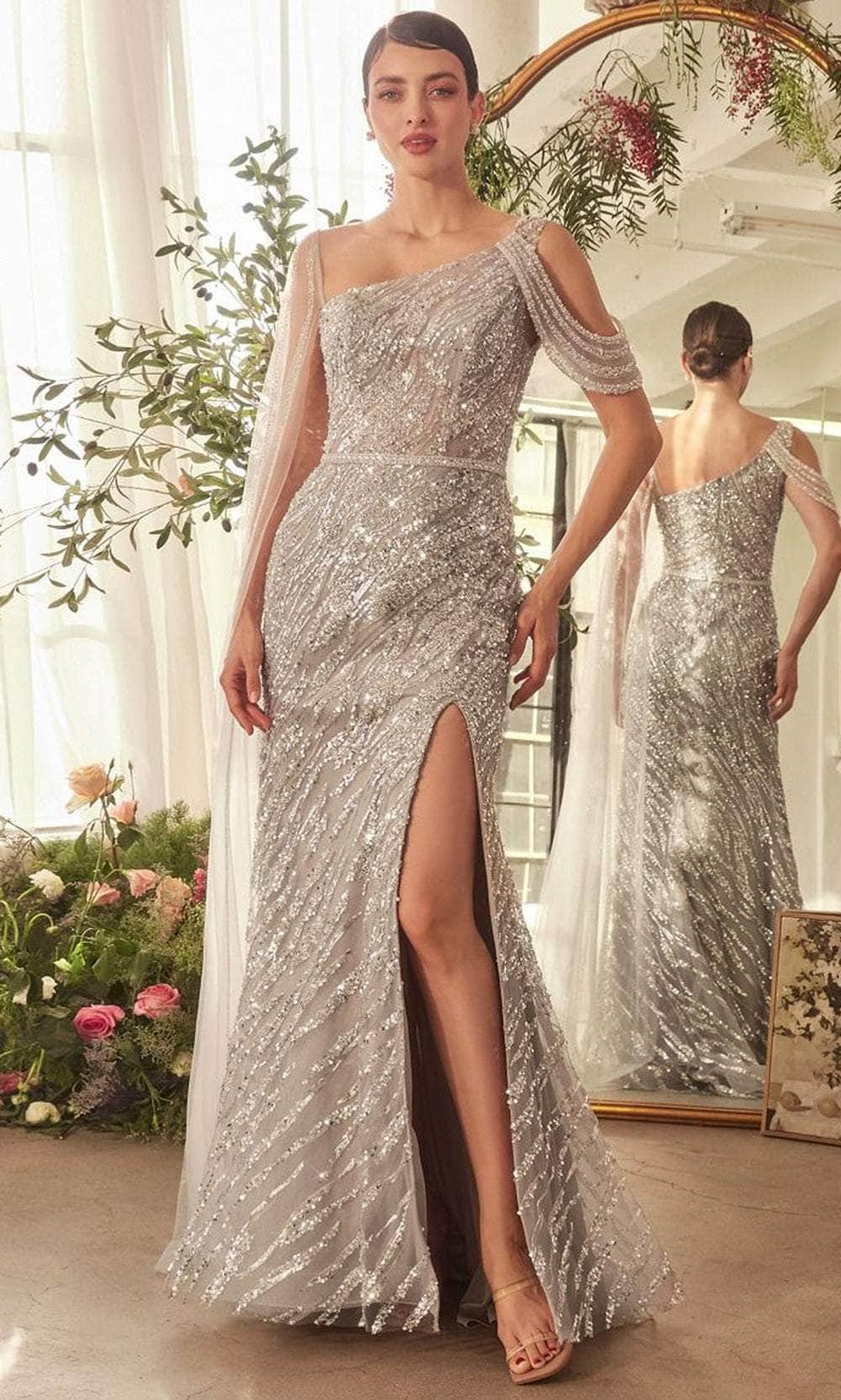 Elevate your style to divine levels with this glamorous masterpiece from Andrea and Leo A1370. Decorated with intricate beadings, this gown fascinating features are the asymmetrical neckline, a sheer cape-like sleeve that flows gracefully on one side and a sultry cold-shoulder cut on the other. A thin beaded belt gracefully cinches the waist for a flattering fit. The mid-open cut in the back adds a touch of modern allure, secured by a hidden zipper closure. The skirt parts with a seductive thigh-high slit, enhancing its flattering sheath silhouette as it flows into a sweep train. Captivate the crowd and sizzle effortlessly in this fabulous Andrea and Leo A1370 gown. Models are wearing Blue, and Silver colors.