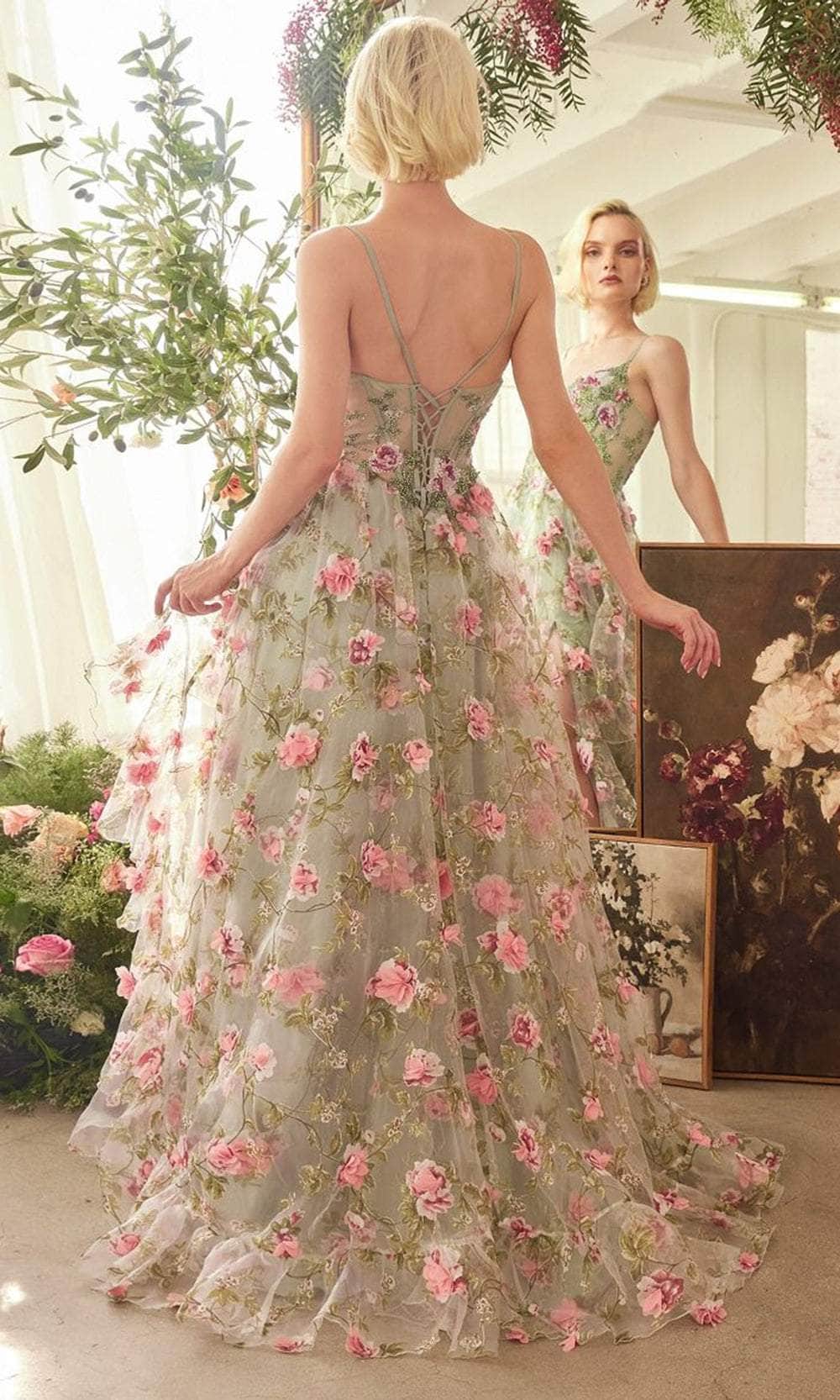 Wrap yourself in creative couture with this Andrea and Leo A1420 masterpiece. With floral prints and 3D floral appliques, this show-stopping organza gown evokes an air of charm and romance. The top bodice showcases illusion corset detail, a sweetheart neckline, and glittery beadings. Spaghetti straps outline the shoulders, and the lace-up closure in the back adjusts to provide a perfect, custom fit. A flowy A-line skirt cascade to the sweeping train, ending with playful ruffles and a high slit. This Andrea and Leo A1420 gown is the ultimate choice for prom or a special night, designed to make you the center of attention. Model is wearing Sage color.