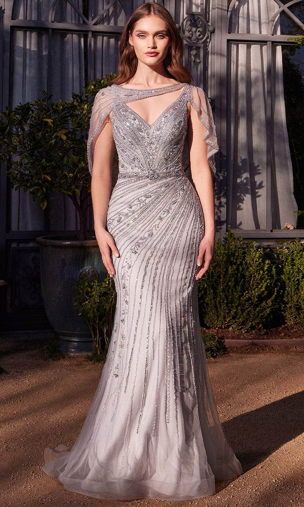 Elevate your elegance with the Andrea and Leo A1443 dress, a stunning creation designed to make a statement at any formal occasion. This fitted gown showcases a flattering V-neckline and intricate beaded motif, enhanced by a stunning beaded tulle overlay that adds a touch of glamour. The asymmetrical cape gracefully drapes over the shoulders, adding a dramatic flair to the form-fitting silhouette. Perfect for the mother of the bride, black tie events, or any special occasion, this Andrea and Leo A1443 blends elegance with modern sophistication, ensuring you turn heads and captivate the crowd with your impeccable style. Model is wearing Silver color.