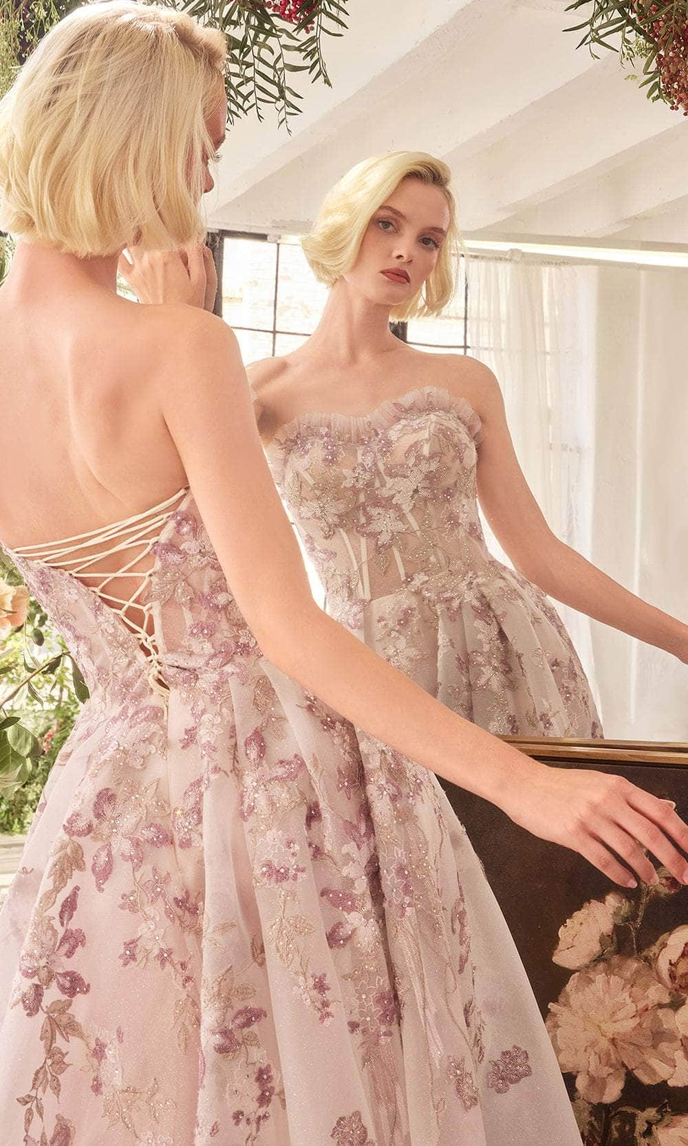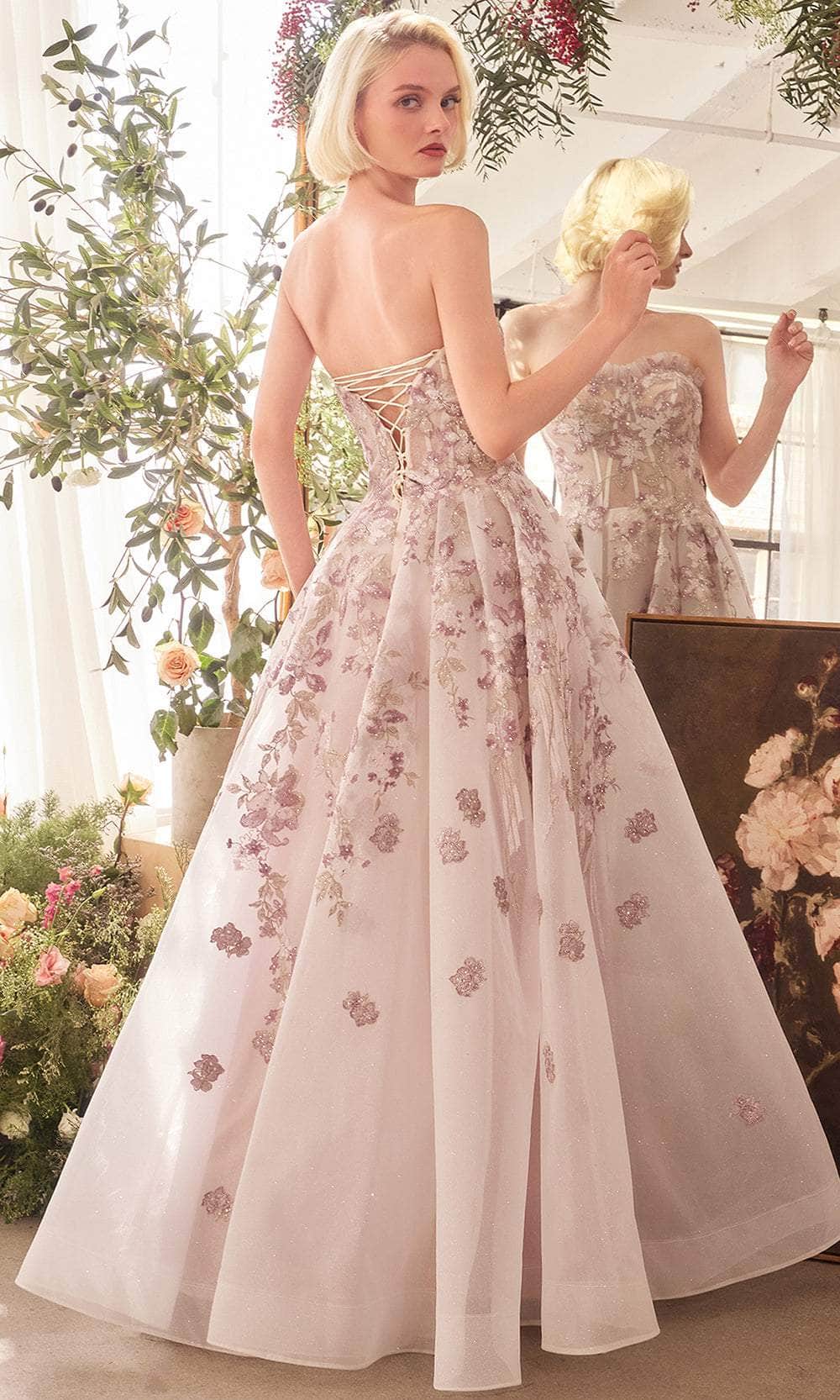 Experience the outstanding effect in this Andrea and Leo A1455 gown, a stunning A-line dress perfect for prom or formal occasions. This exquisite gown features a strapless sweetheart neckline with a ruffle-edged bodice adorned with delicate floral appliqué details, adding a touch of romantic charm. The structured bodice provides enhanced support, ensuring a flawless fit, while the stiff organza skirt creates a voluminous silhouette that is perfect for twirling. Combining sophistication with a playful touch, this Andrea and Leo A1455 guarantees you will make a memorable entrance and captivate the crowd with your grace and style. Model is wearing Mauve color.