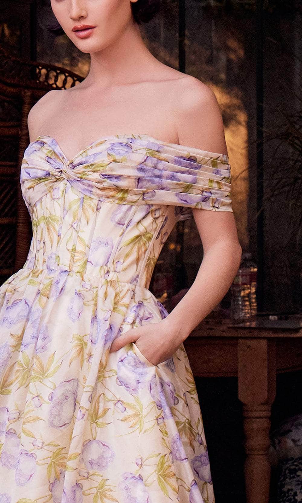 Be the talk of the evening in this garden-inspired masterpiece from Andrea and Leo A1466. The gown is made from soft organza and is adorned with vibrant floral prints throughout. A ruched knotted detail at the bust and pleated design adds a playful, flattering element. Captivating features are the sweetheart off-shoulder neckline, short sleeves, and daring mid-open back. A corset bodice with visible boning offers structural support. The skirt beautifully forms an A-line silhouette that embraces all shapes, culminating in a sweep train and side pockets. Bloom with loveliness in this Andrea and Leo A1466 gown. Models are wearing Blue, Orange, and Pink colors.