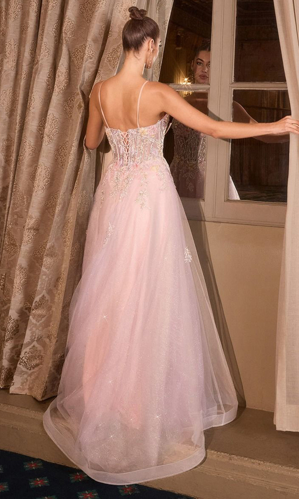 Presenting the Andrea and Leo A1477, an enchanting ballgown that blends delicate romance with dramatic flair. The ensemble showcases a deep V neckline framed by a sheer structure, adorned with floral printed appliques and shimmering beadwork that evoke fairy tale elegance. Beneath, a layered glitter tulle skirt adds luminous movement and volume while thin straps offer support and structure. A lace up back ensures a flattering fit, and the sweep train leaves a lasting impression. Make your statement in the Andrea and Leo A1477 where ethereal meets strikingly beautiful. Model is wearing Multi color.