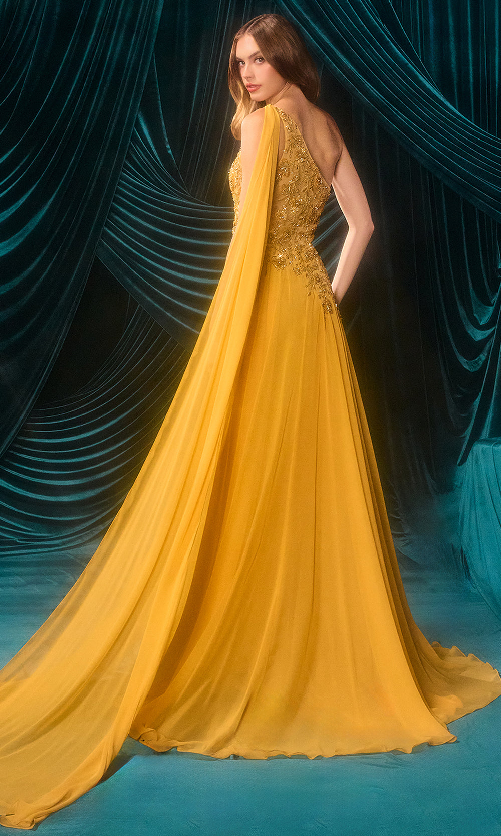Regal elegance comes alive in a gown that embodies timeless sophistication, beautifully captured in Andrea and Leo A1495. The one-shoulder neckline is adorned with intricate beaded floral appliqué, while the sheer bodice flows seamlessly into a chiffon skirt that moves with effortless grace. A dramatic cape drape adds goddess-like allure, elevating the silhouette with couture artistry. Perfect for galas, red carpet evenings, or formal celebrations, Andrea and Leo A1495 is a statement of glamour and refinement. Model is wearing Marigold color.