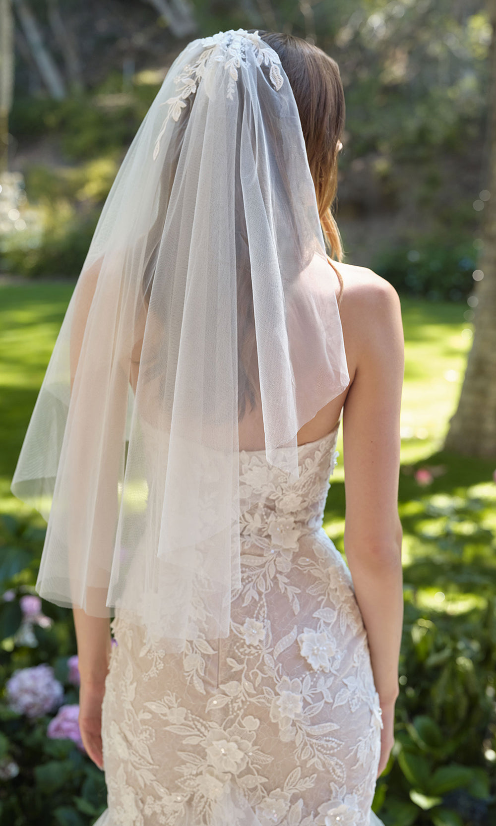 Romantic artistry meets modern couture in a gown that celebrates the essence of bridal elegance, beautifully embodied by Andrea and Leo WL062. The strapless sweetheart neckline and sheer corset bodice are adorned with cascading floral appliqué, sculpting the figure with ethereal detail. Layers of soft tulle form a tiered skirt with dramatic flair, balancing structure with whimsical movement. Finished with a 30" veil, this fit-and-flare silhouette is perfect for ceremonies, receptions, or bridal portraits. Andrea and Leo WL062 ensures unforgettable sophistication. Model is wearing Off White-Nude color.