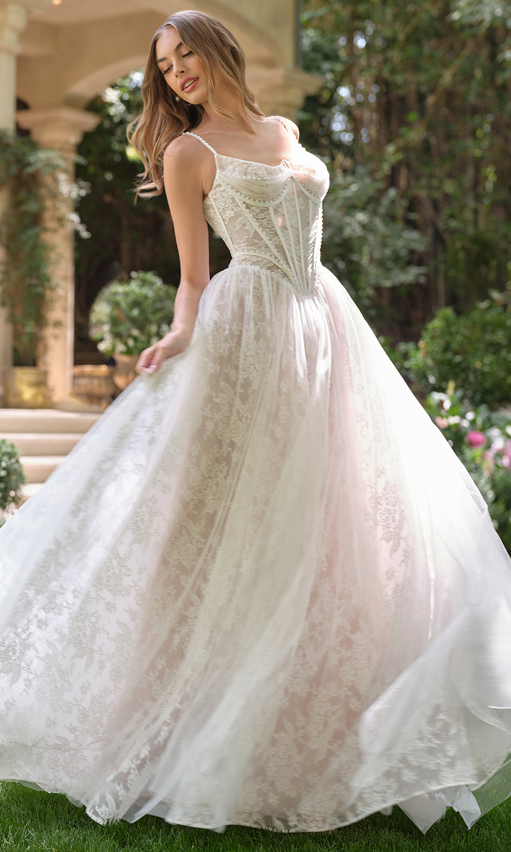 Romantic elegance blooms in a gown that feels both modern and timeless, beautifully embodied by Andrea and Leo WL069. Crafted in delicate lace and sheer tulle, the A-line silhouette is enhanced by a structured corset bodice with exposed boning, a scoop neckline, and pearl-detailed straps. The Basque waist adds refinement, while the flowing skirt cascades into a dramatic chapel train layered with floral lace. Perfect for garden ceremonies or outdoor “I do’s,” Andrea and Leo WL069 is bridal artistry at its finest. Model is wearing Off White-Nude color.
