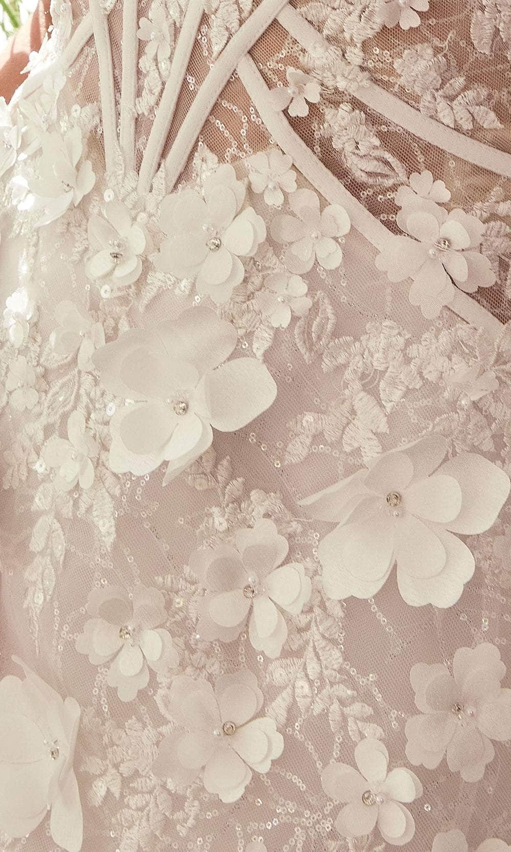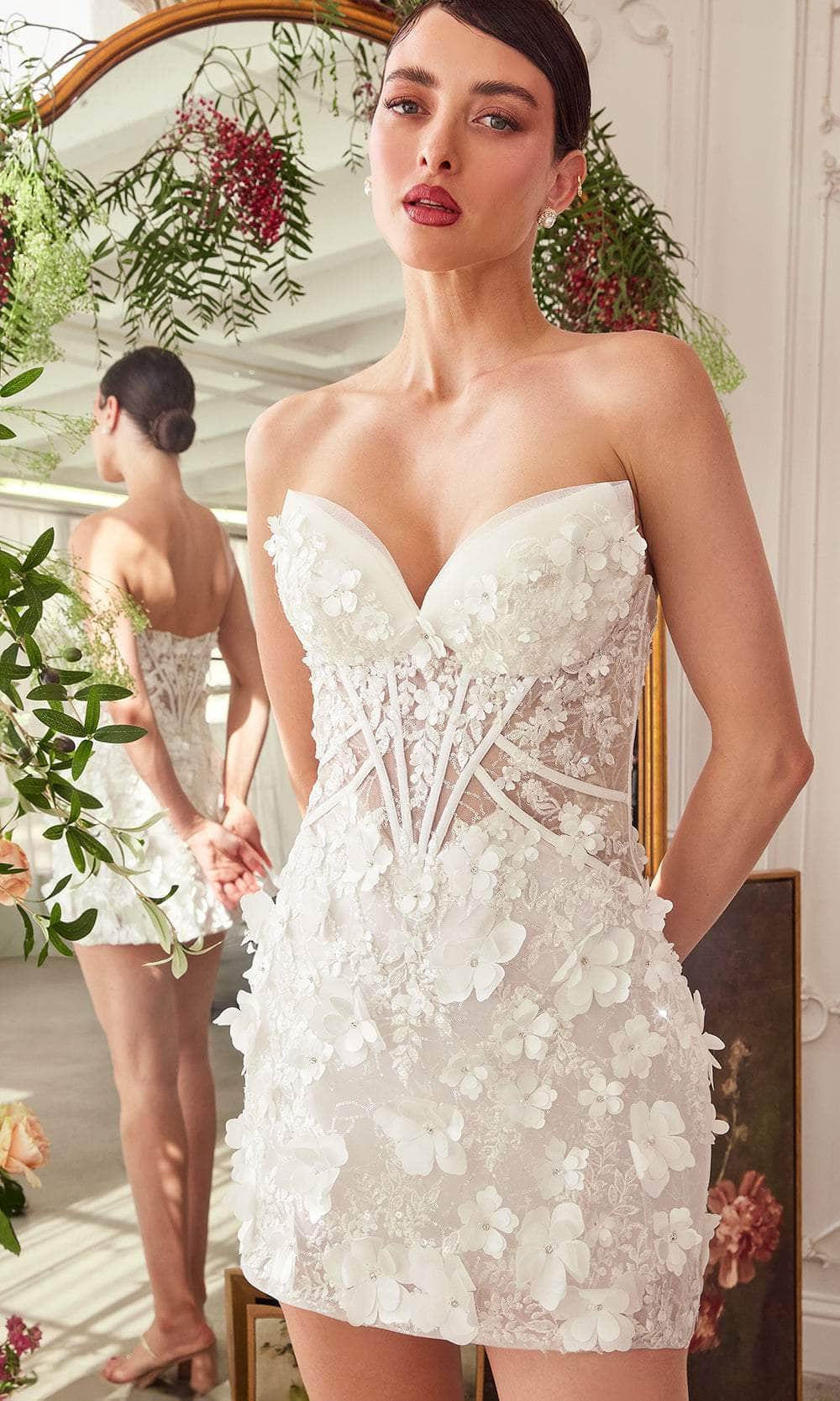 Make a stylish and memorable impression with this Andrea and Leo WL083 dress, a chic sheath gown perfect for wedding receptions, engagement photoshoots, or rehearsal dinners. This stunning dress features a strapless sweetheart neckline and a sheer, structured boned bodice for a flattering and secure fit. The dimensional floral appliqué on the lace skirt adds an elegant touch to the short A-line silhouette, offering both style and movement. Combining grace with contemporary charm, this Andrea and Leo WL083 ensures you showcase your sophisticated taste and effortless beauty. Model is wearing Off White color.
